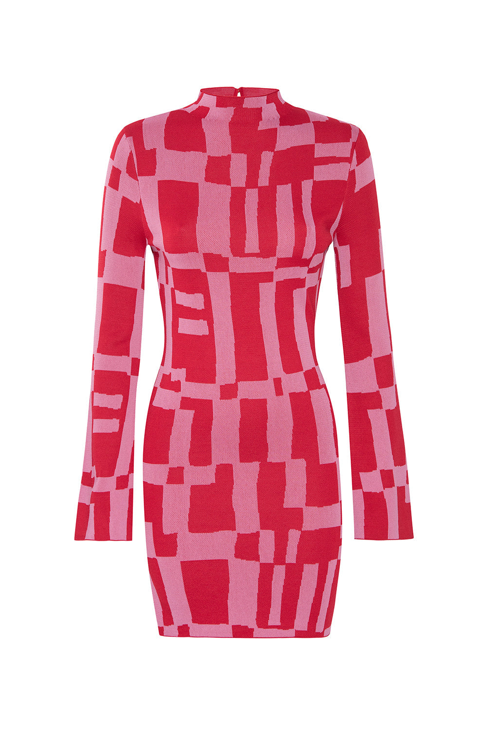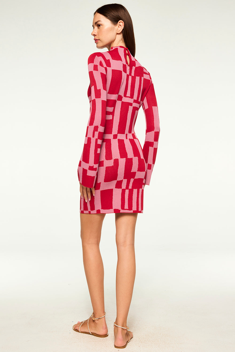 Kalen is a new stretch knit mini dress in a two-tone geometric pattern. This fitted silhouette features a mock turtleneck with double back button closure and long, slightly flared sleeves. Pair with knee-high boots for the colder months and with strappy flat sandals for a resort-ready look.