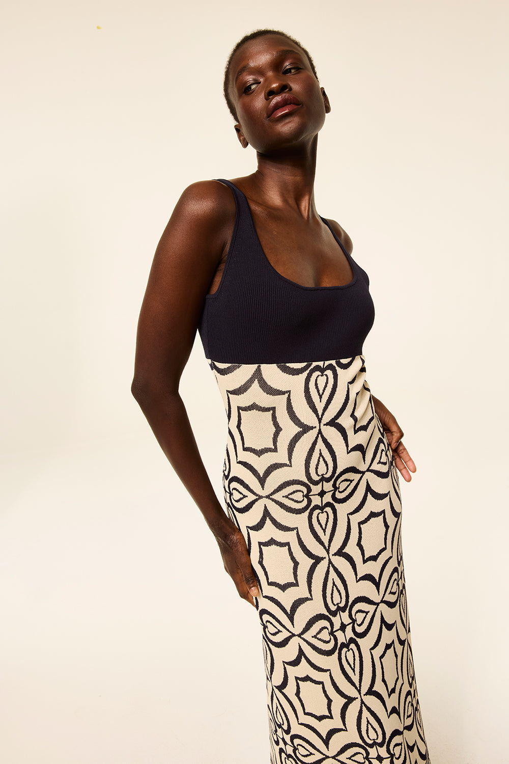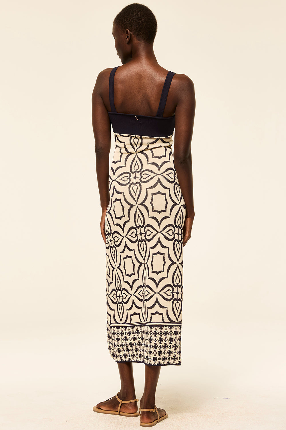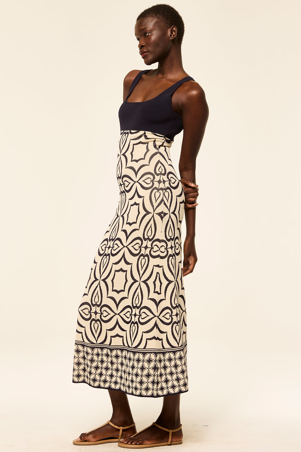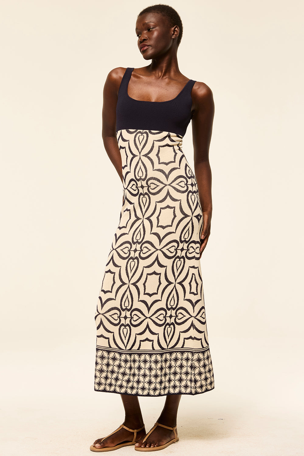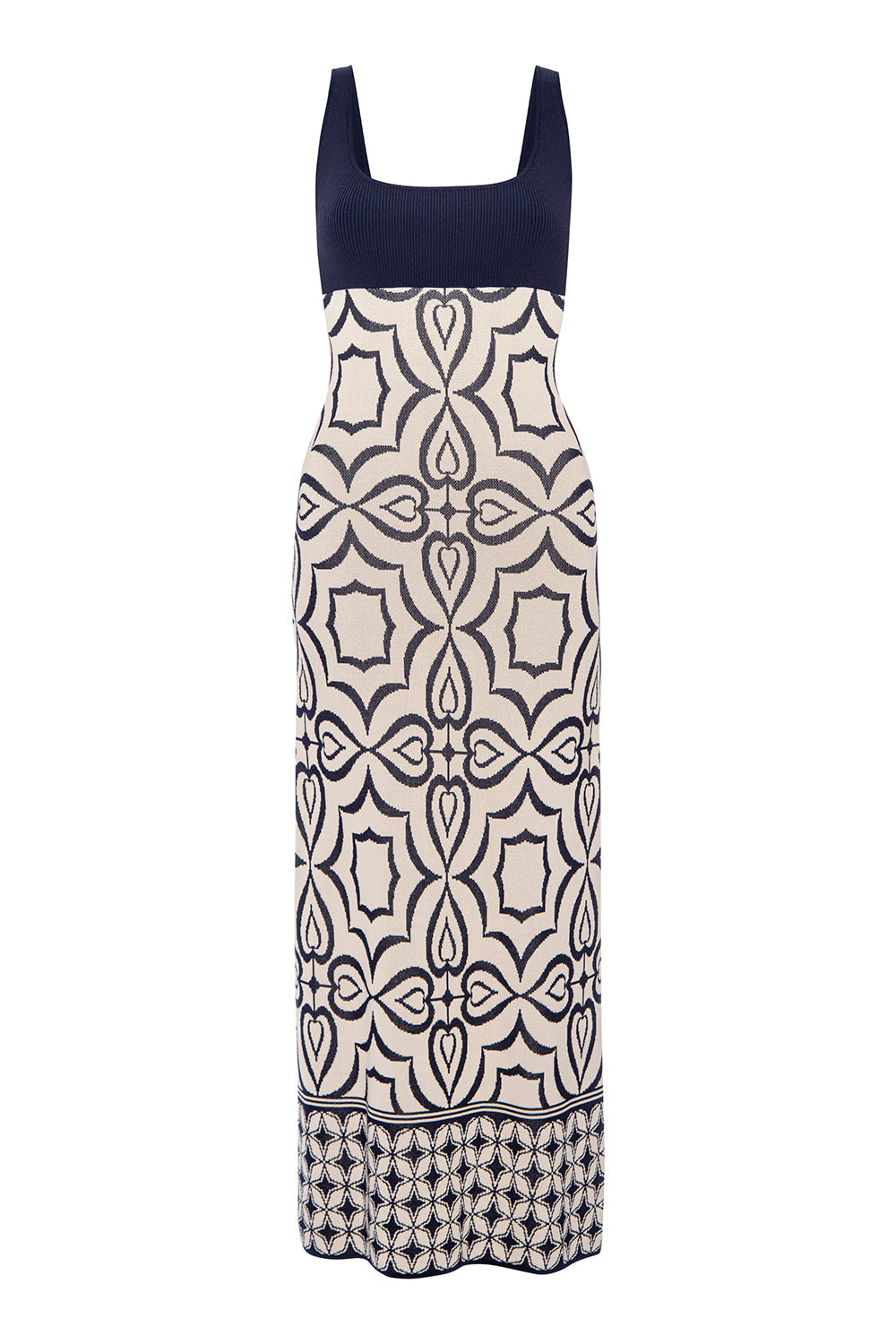 Our Kalil knit dress is a maxi length fitted silhouette in navy and ivory mosaic tile print knit jacquard. Sleeveless with thin straps and a square neckline and back. Pull-on style with a ribbed bodice.