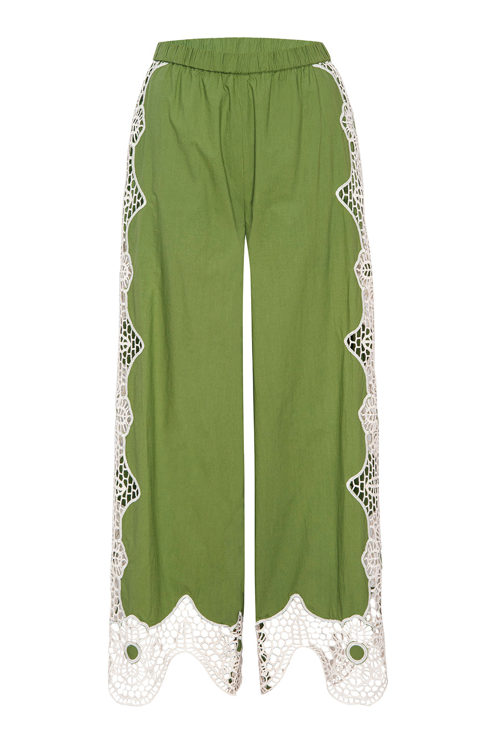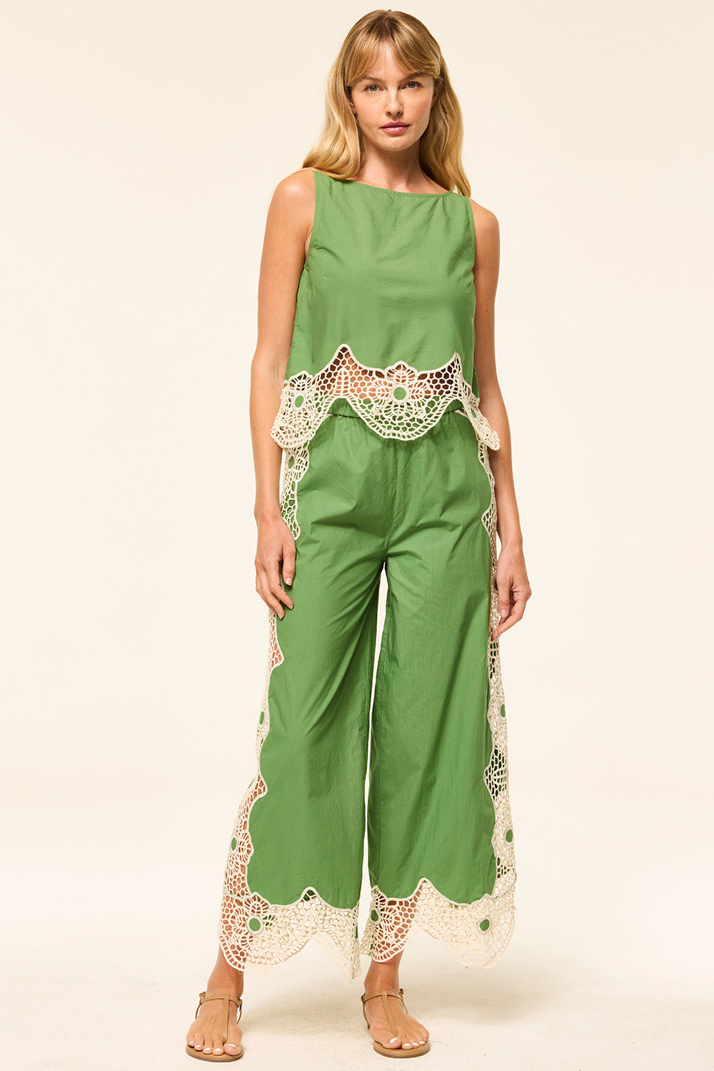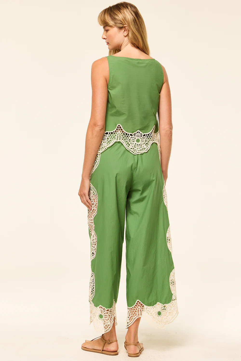 Our cropped Kalina pant is cut from a fresh green cotton poplin and features gorgeous ivory lace embroidered details on the sides and hem. Partially lined. Pair this culotte style pant with the coordinating Nola top for a standout spring set.