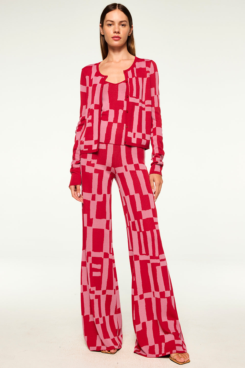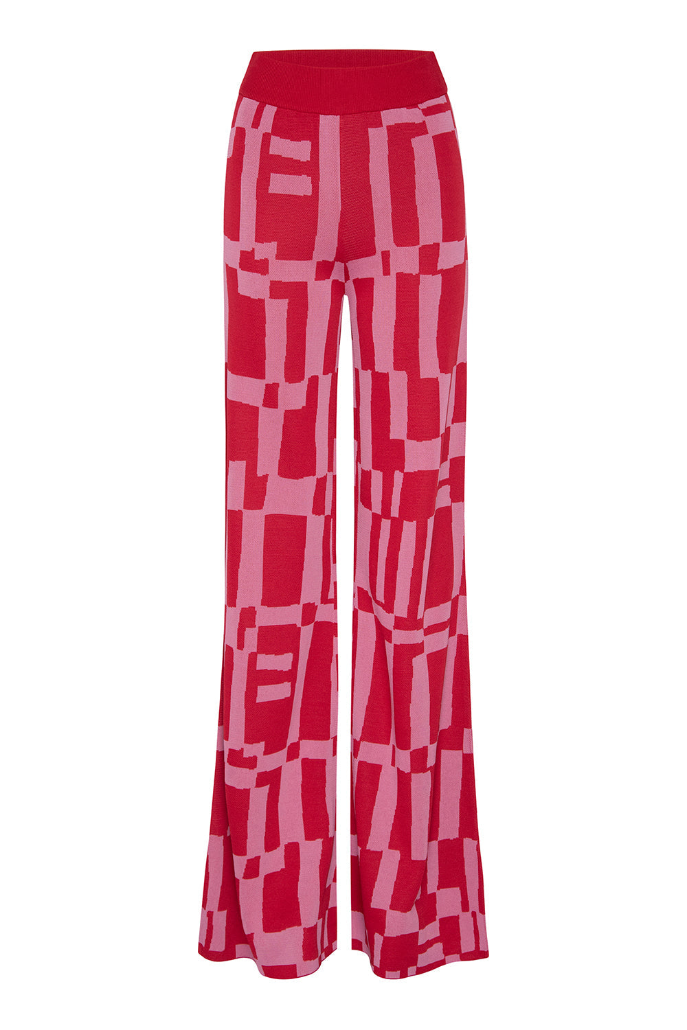 Our new Koa pant is a knit fit and flare style in a bold two-tone pink and red geometric pattern. Featuring a wide banded waist. Fitted through hips and legs leading into wider slightly flared legs. Pair with the coordinating Elva cardigan and Una top for a head to toe statement.