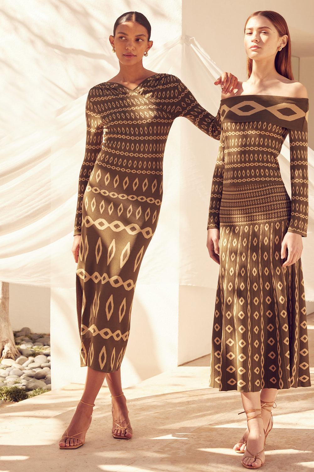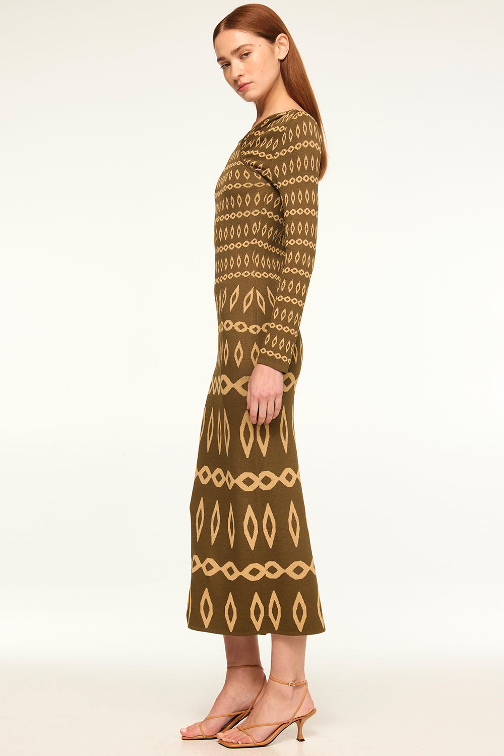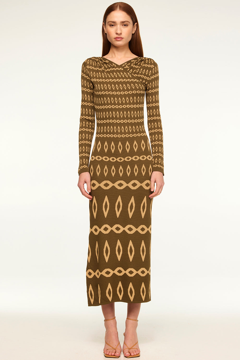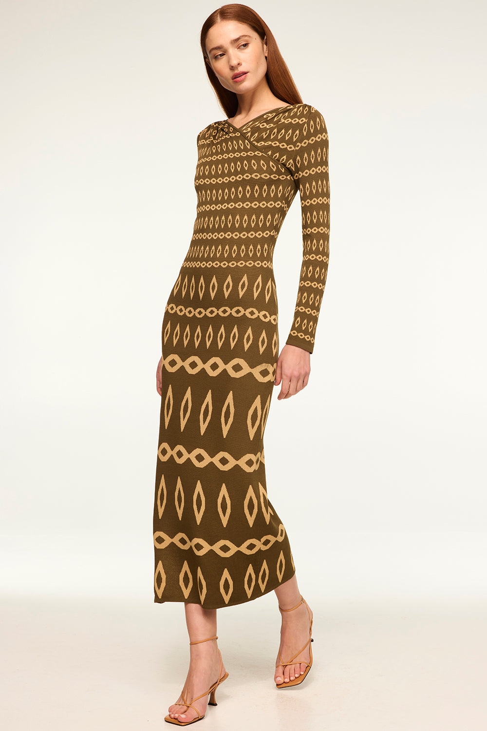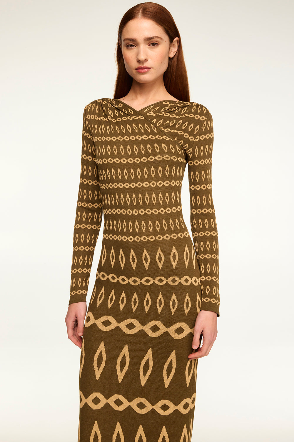 Our new Lainey dress is a body-hugging stretch knit jacquard dress in a flattering olive geometric pattern. A v crossover neckline features a flattering gathered detail at the shoulders and leads into long fitted sleeves. A fitted bodice and midi length fitted skirt. Pair with boots or heels for the perfect transitional look.