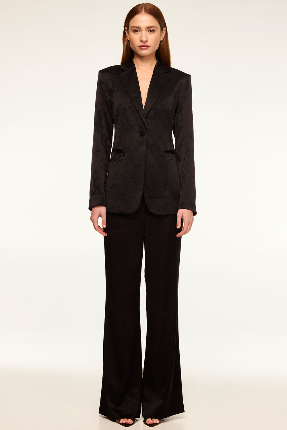 Our new Lauren blazer is cut from a black satin jacquard with floral tonal detailing throughout. This fitted blazer is the perfect transitional piece for fall. A v neckline with notch lapels and a single covered button closure. Double front slit pockets. Structured shoulders. Long sleeves with triple covered button closure. Back vent. Complete the look with the coordinating Remi pant for the chicest fall suiting or throw on over one of our dresses.