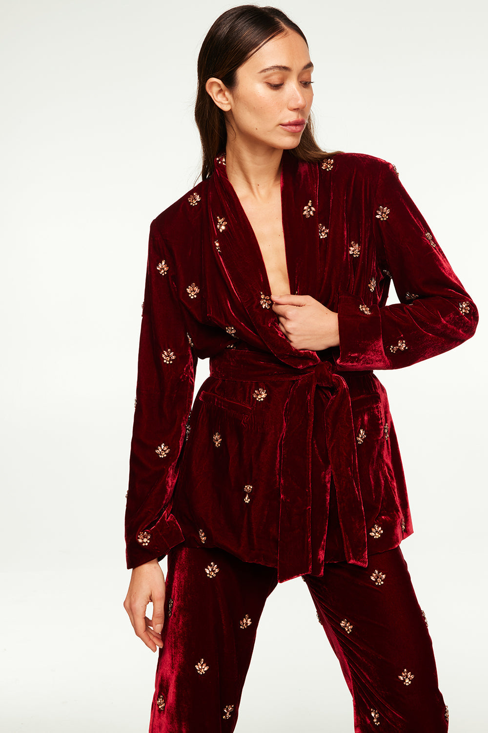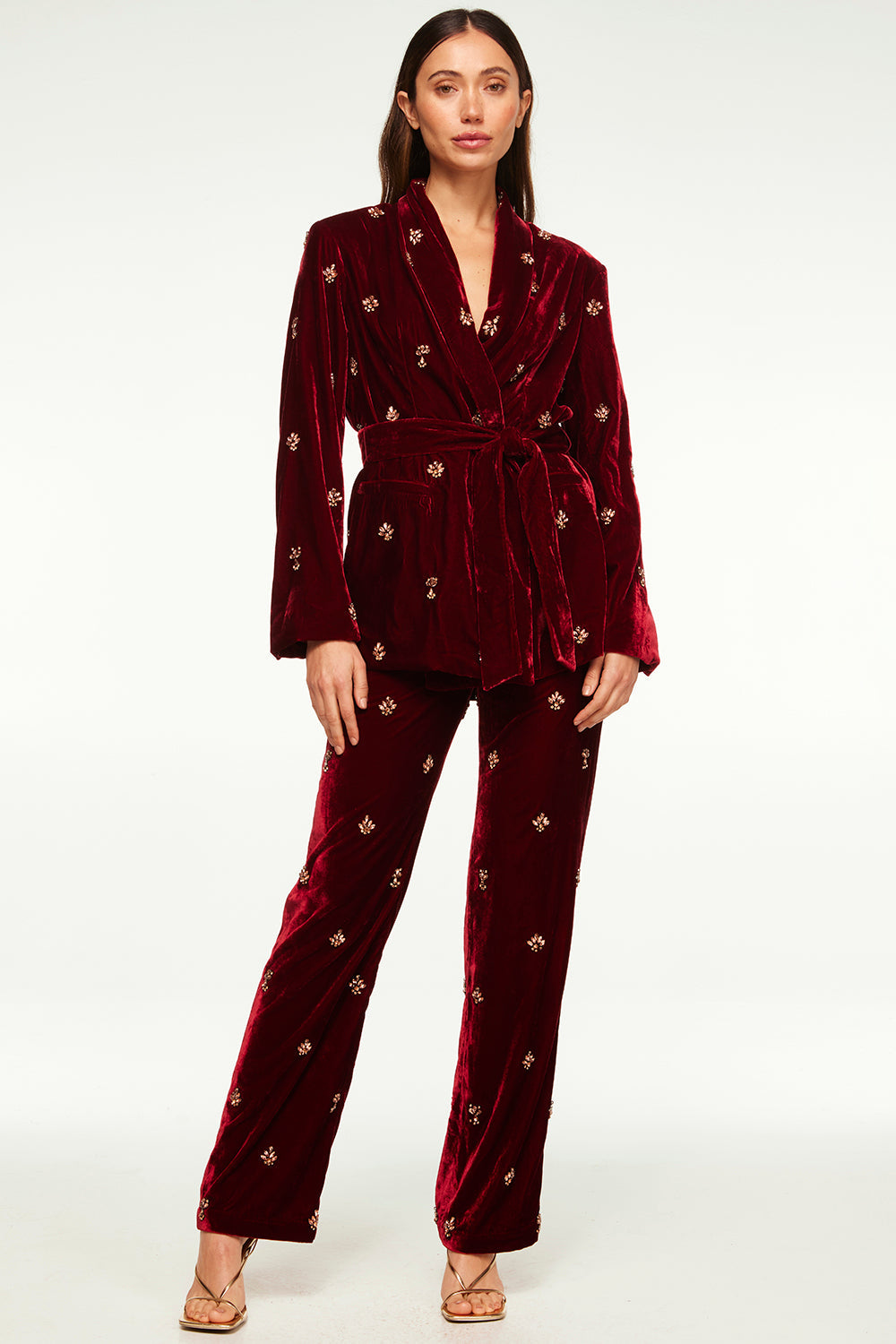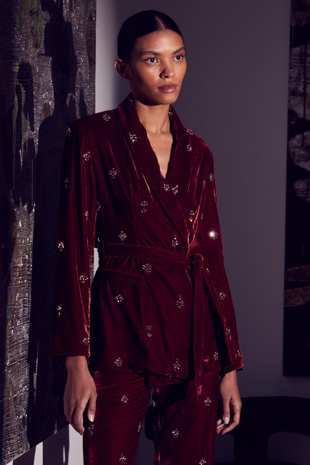 Our Lena blazer is holiday perfection in this season's must-have hue. Cut from a luxe garnet velvet and embellished with tonal rhinestone clusters allover. This relaxed blazer features long sleeves, a back vent, fold-over collar, slightly structured shoulders and a self-tie belt with front slit faux pockets. Pair with the coordinating Harlow pant for a stunning suit.
