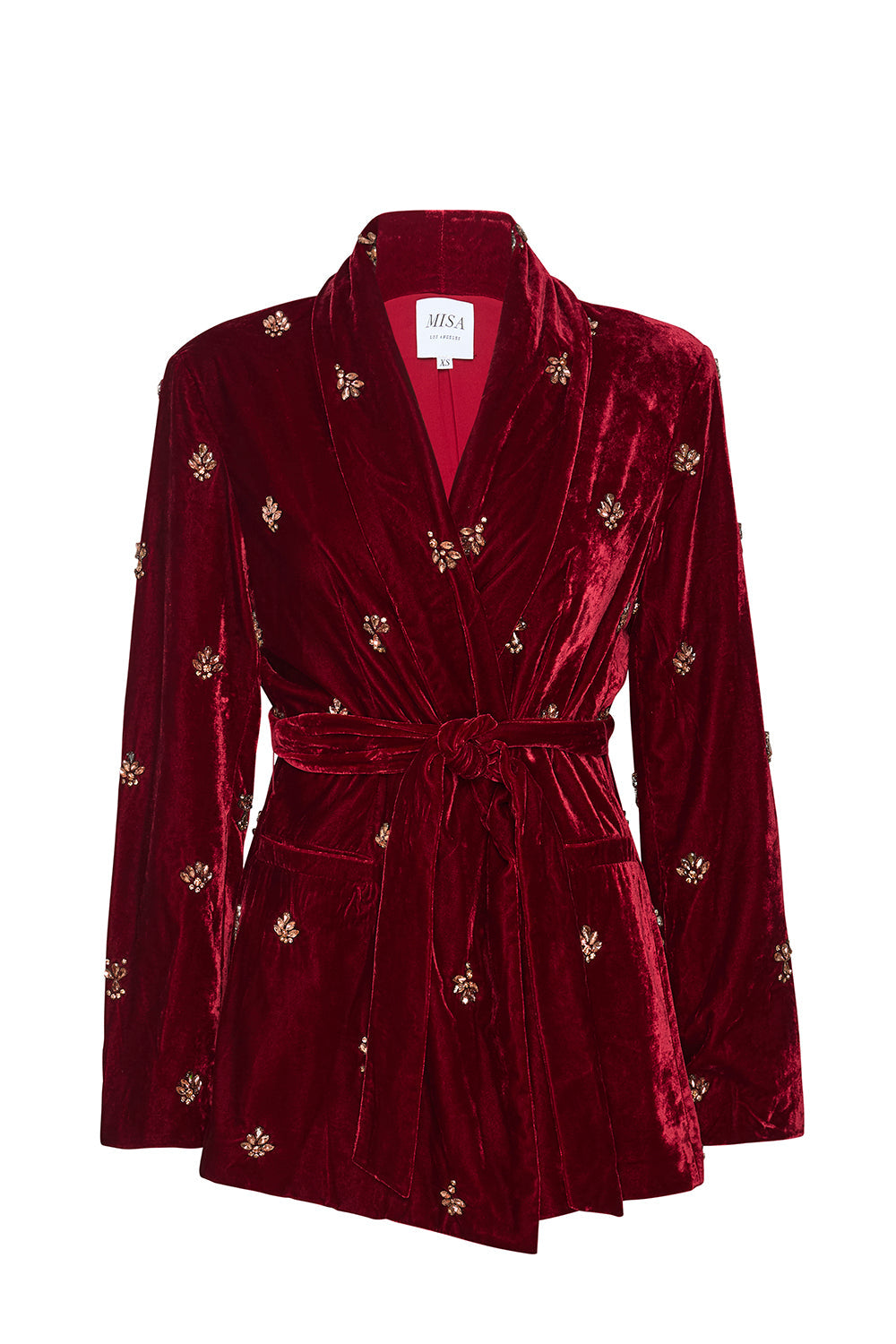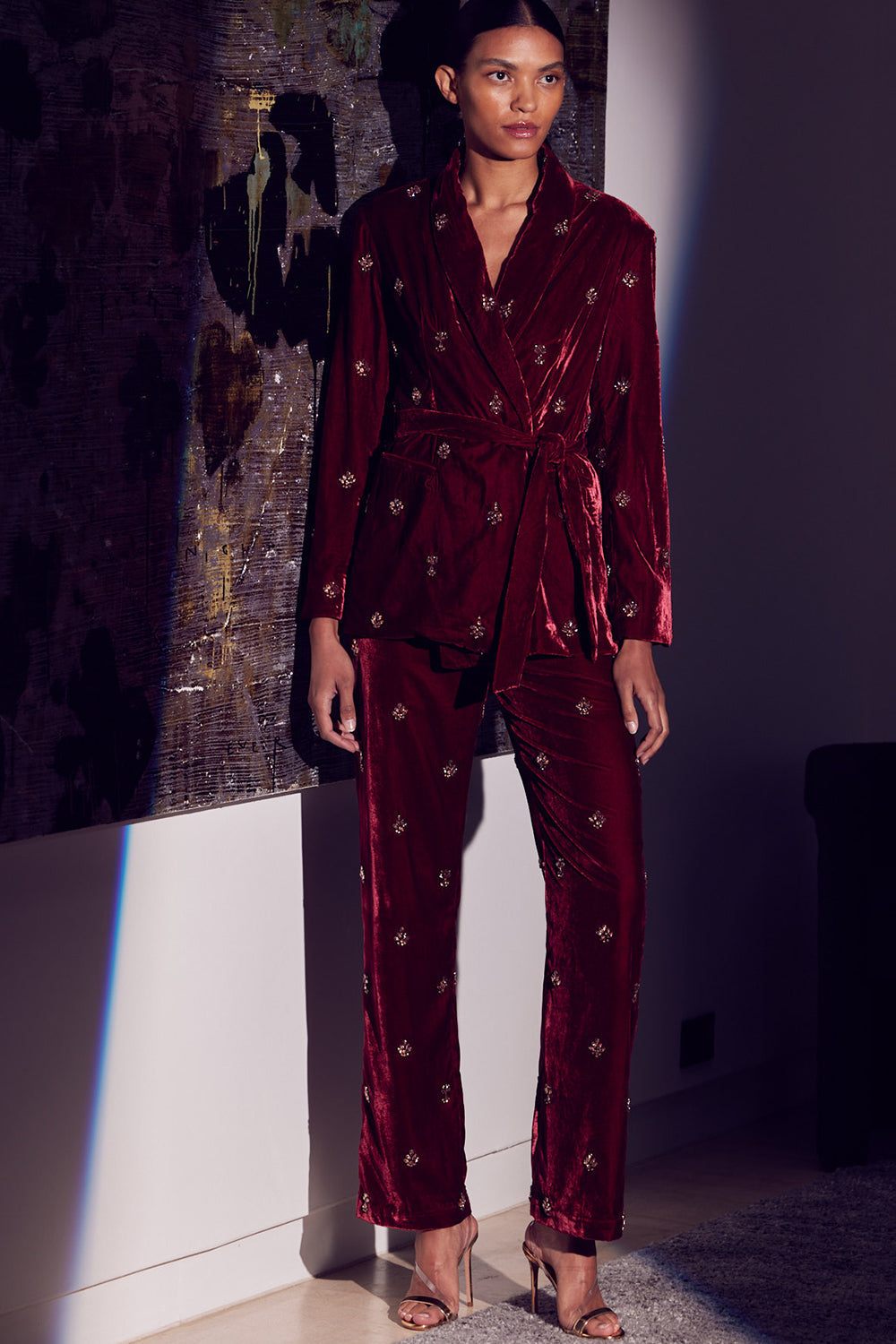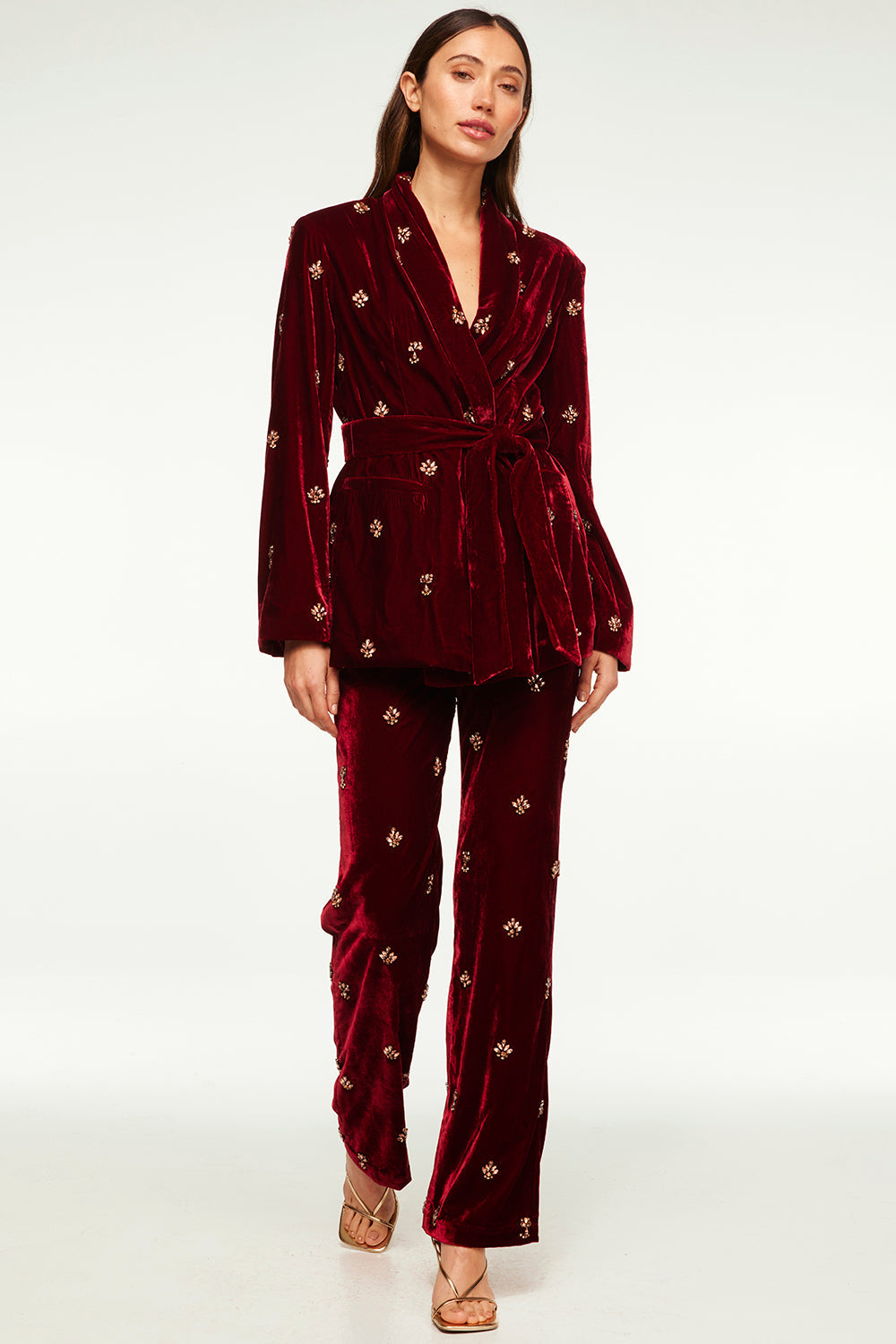 Our Lena blazer is holiday perfection in this season's must-have hue. Cut from a luxe garnet velvet and embellished with tonal rhinestone clusters allover. This relaxed blazer features long sleeves, a back vent, fold-over collar, slightly structured shoulders and a self-tie belt with front slit faux pockets. Pair with the coordinating Harlow pant for a stunning suit.
