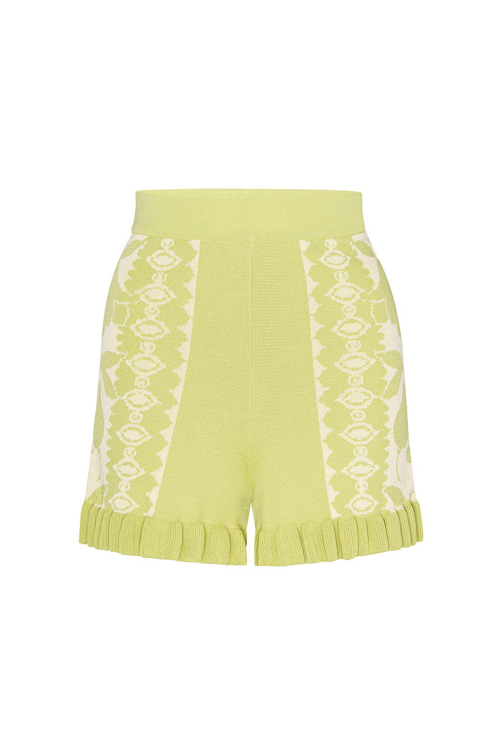 Lexi is a playful summer essential, crafted from vibrant citron stretch knit jacquard with a contrasting cream motif along the sides. Fitted through the body and finished with a delicate ribbed ruffle trim, it’s perfect for effortless warm-weather styling. Pair with your favorite white tee for a casual look or the coordinating Miley peplum top for a fresh, coordinated summer set.
