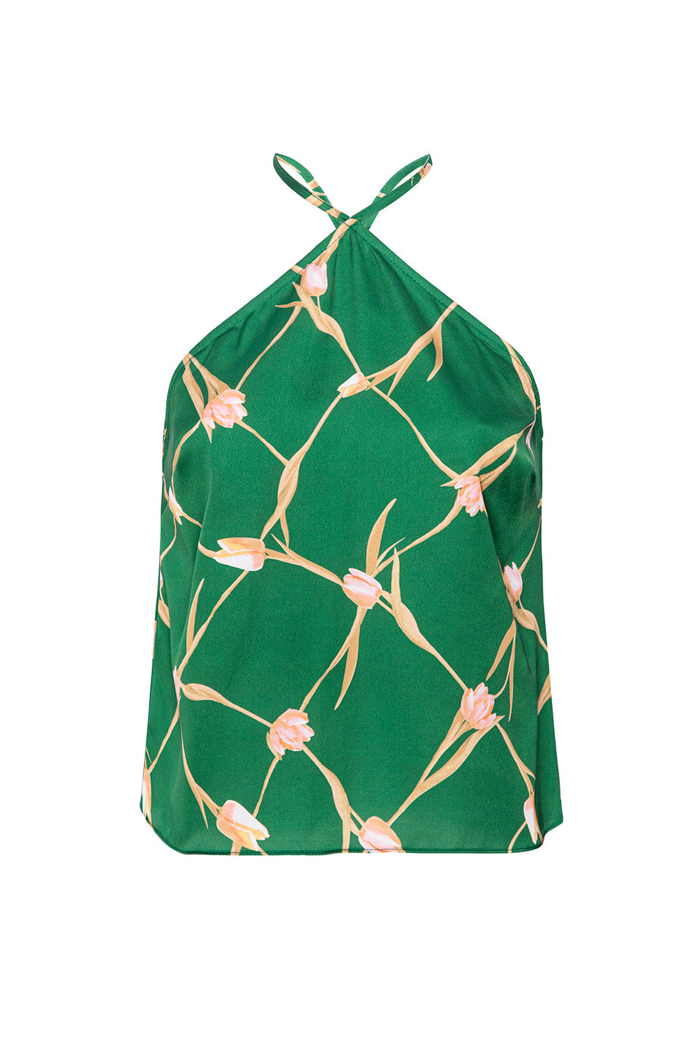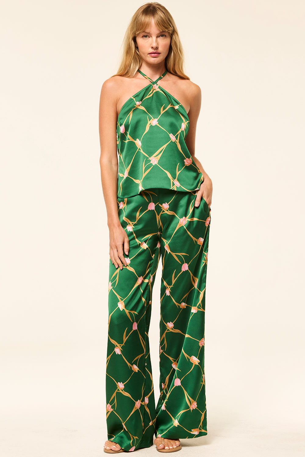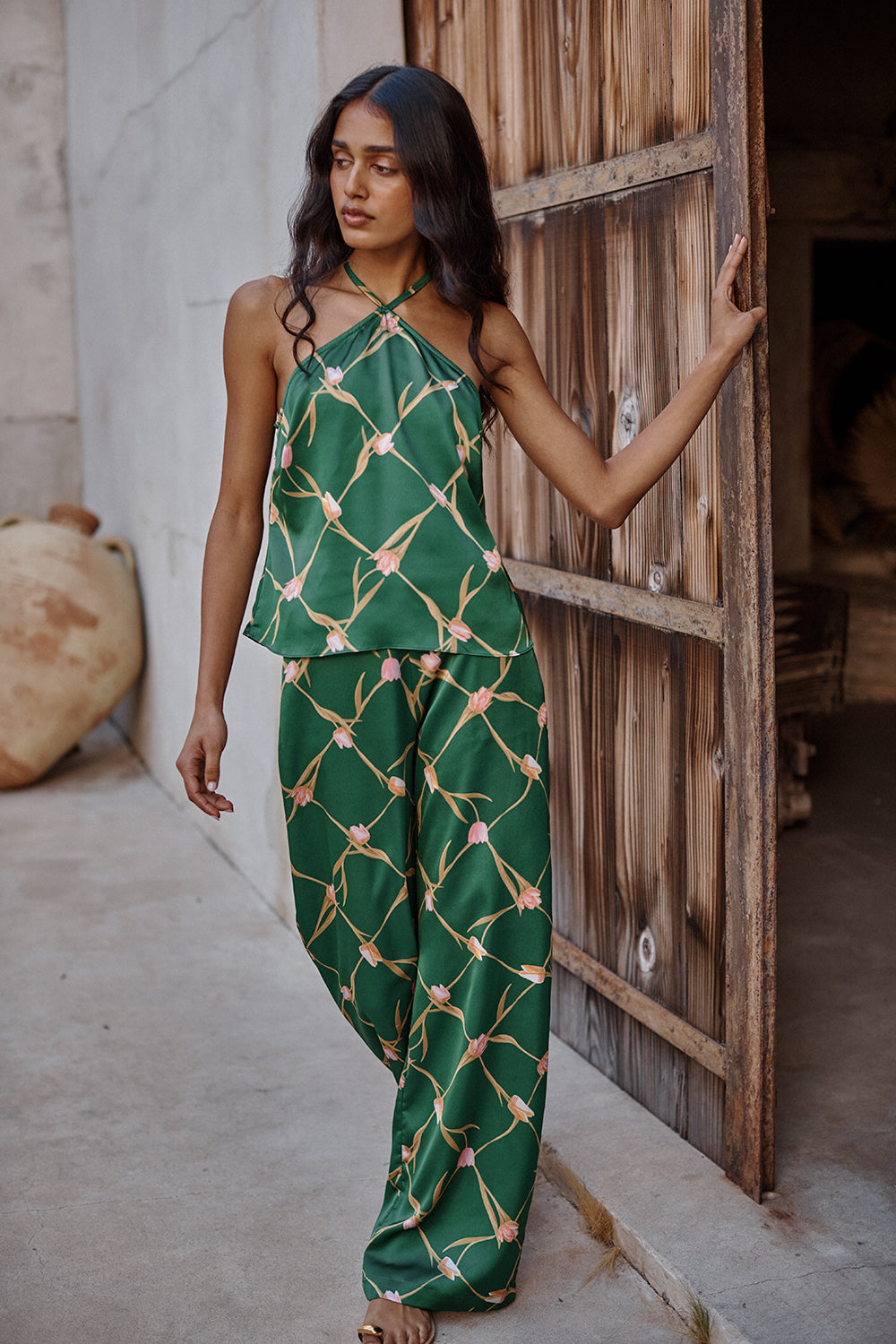 Lina is a halter-neck top cut from our Tulip Lattice printed satin in a rich green hue. A relaxed fit and keyhole button-back closure. Pair with the coordinating Izzie pant for an easy spring set.