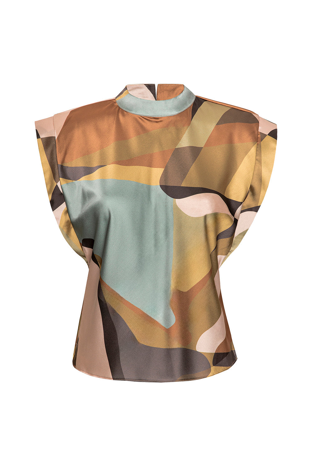 The Lucy Top is a satin blouse in our graphic Desert Abstract print. This sleeveless style features subtly capped shoulders, a relaxed draped silhouette, high neckline, and a back button keyhole closure. Pair it with the coordinating Izzie Pant for a modern, head-to-toe look.