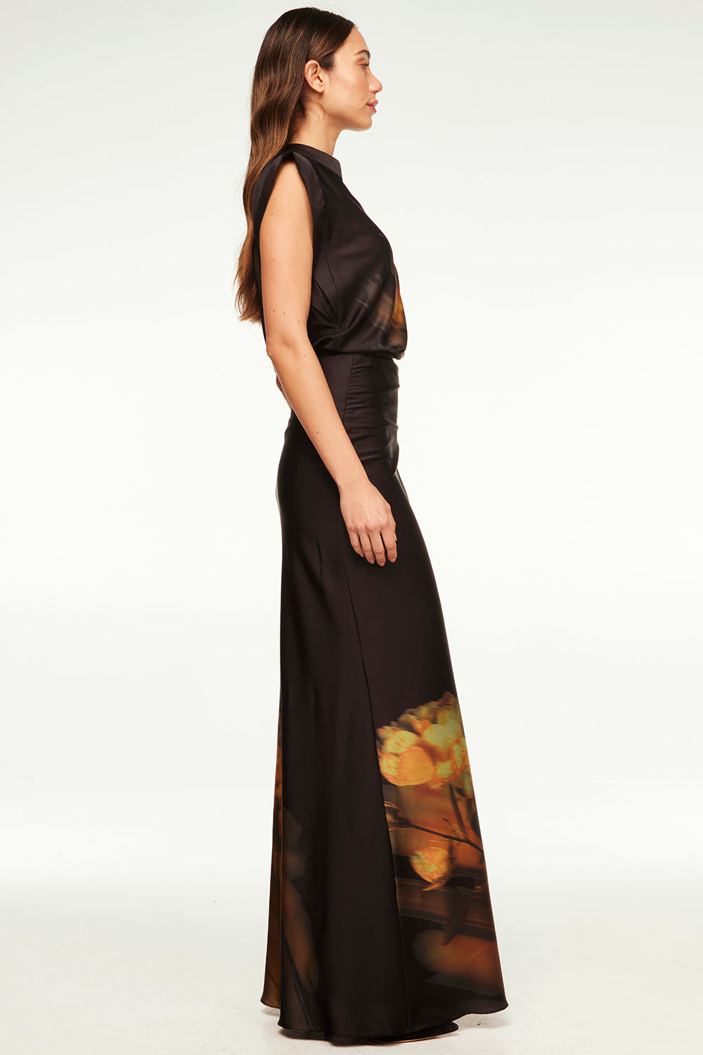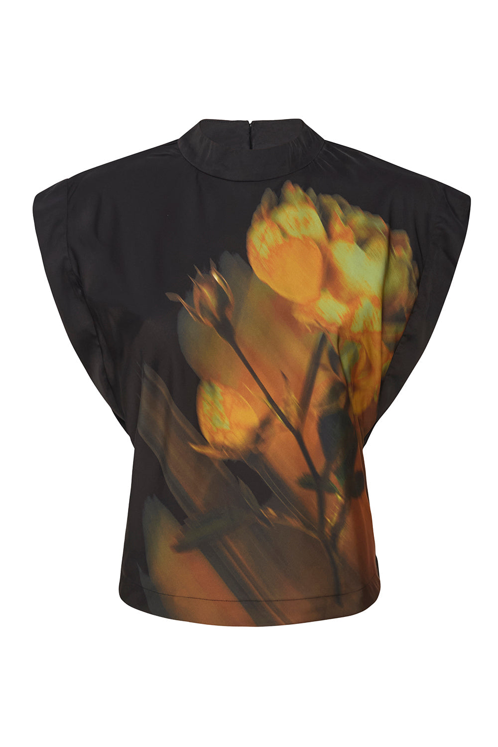 Our Lucy top is a a satin blouse with a beautiful blurred yellow rose printed on the front. Featuring short dolman sleeves, a draped fit, high neckline and button keyhole closure back. Pair with the coordinating Sierra skirt for a sophisticated set.