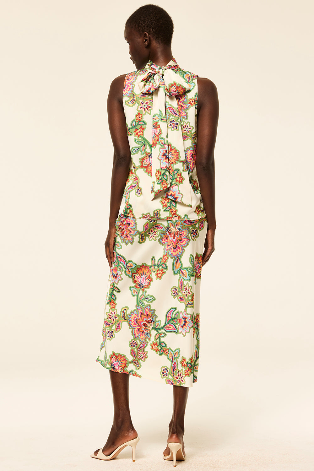 The sleeveless Luka top is an easy high-neck sleeveless silhouette cut from a gorgeous Floral Lattice printed satin. Featuring a self-tie at the neckline, this versatile style can be paired with everything from the coordinating Fay skirt to wide leg trousers under an oversized blazer.