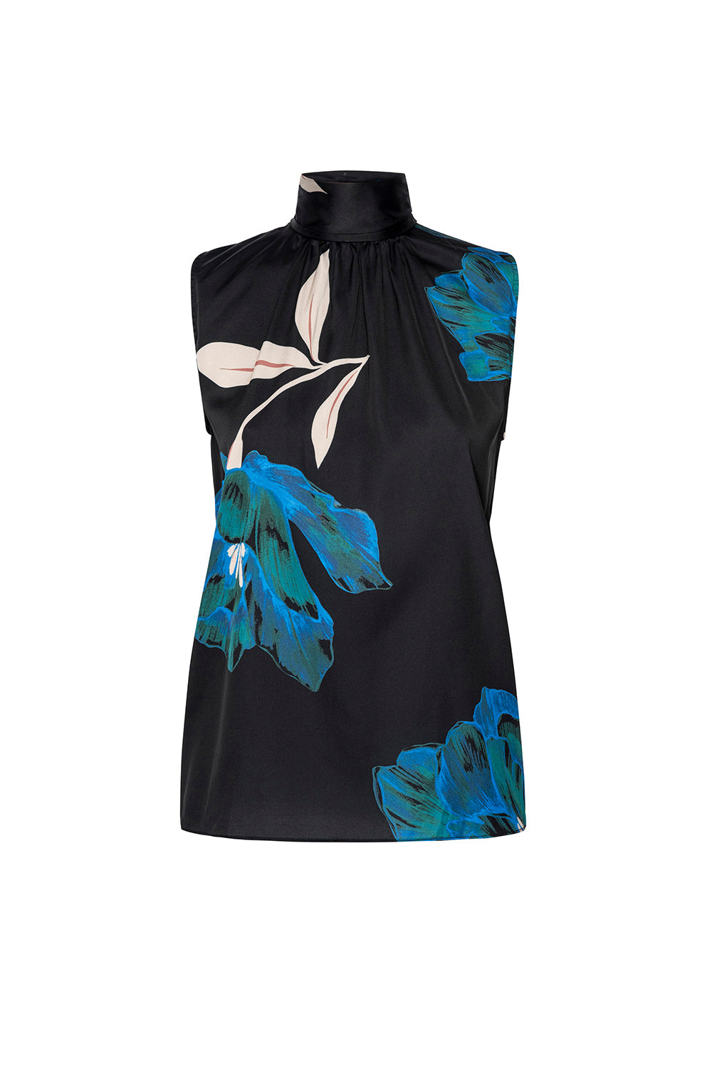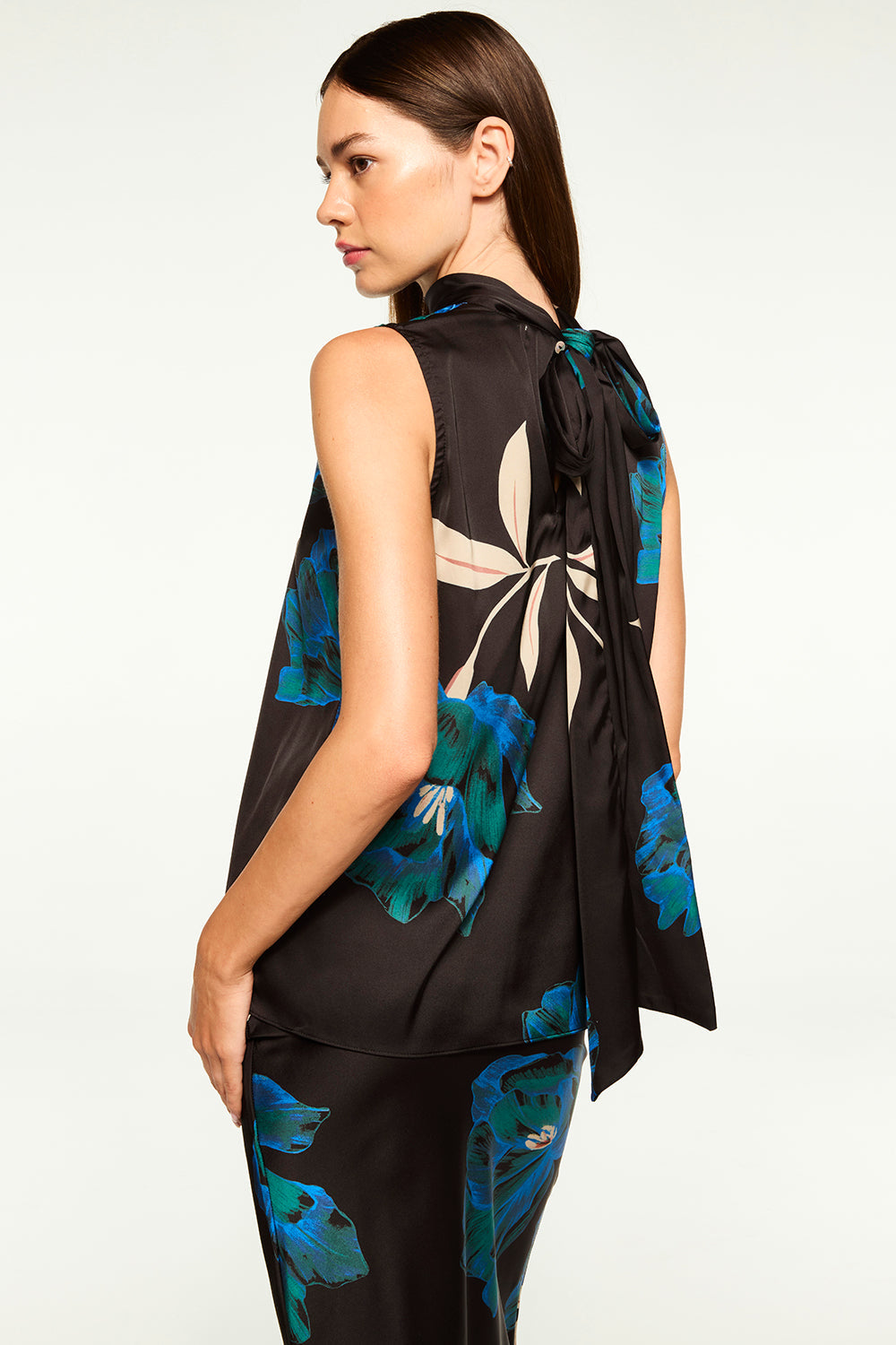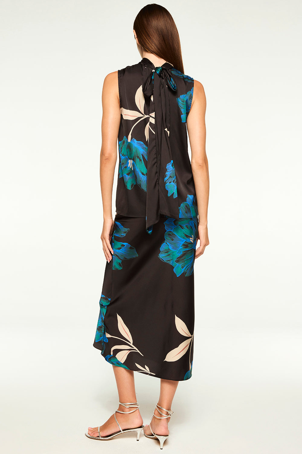 The sleeveless Luka top is an easy high-neck sleeveless silhouette cut from a transitional Nightshade Flora printed satin. Featuring a self-tie at the neckline, this versatile style can be paired with everything from the coordinating Fay skirt to wide leg trousers under an oversized blazer.