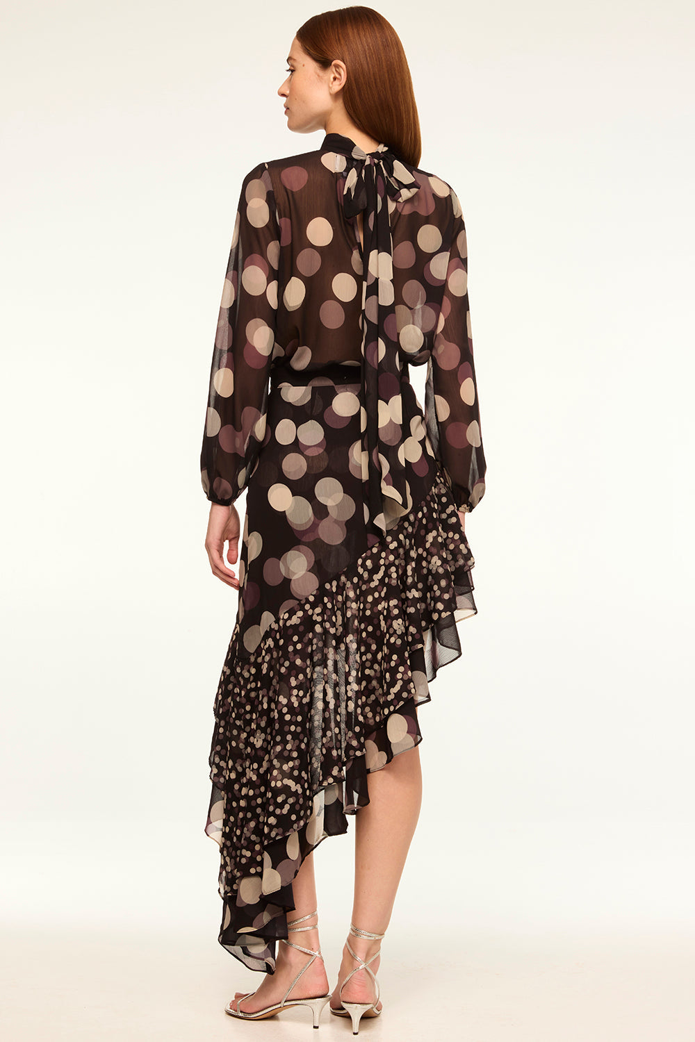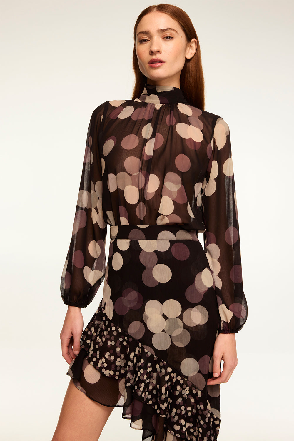 The Lulu top is a dreamy high neck silhouette cut from a chic polka dot print chiffon. The high neck is finished with a tie and hook closure. Long sleeves with elastic cuffs. Semi sheer. Pair with everything from denim to our coordinating Sky skirt for the perfect holiday set.