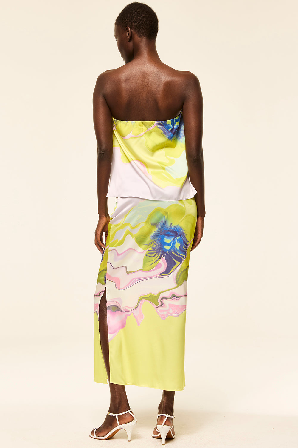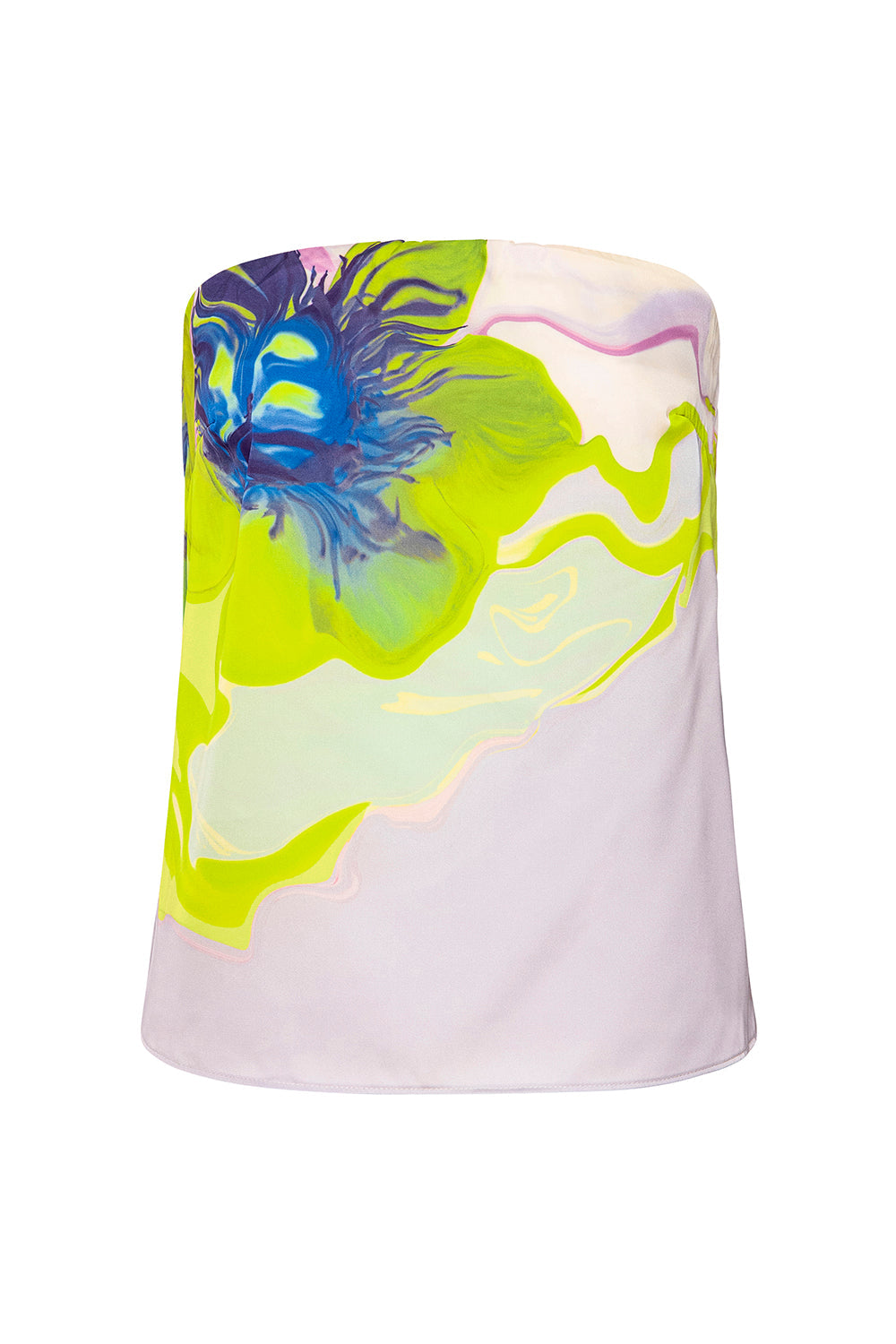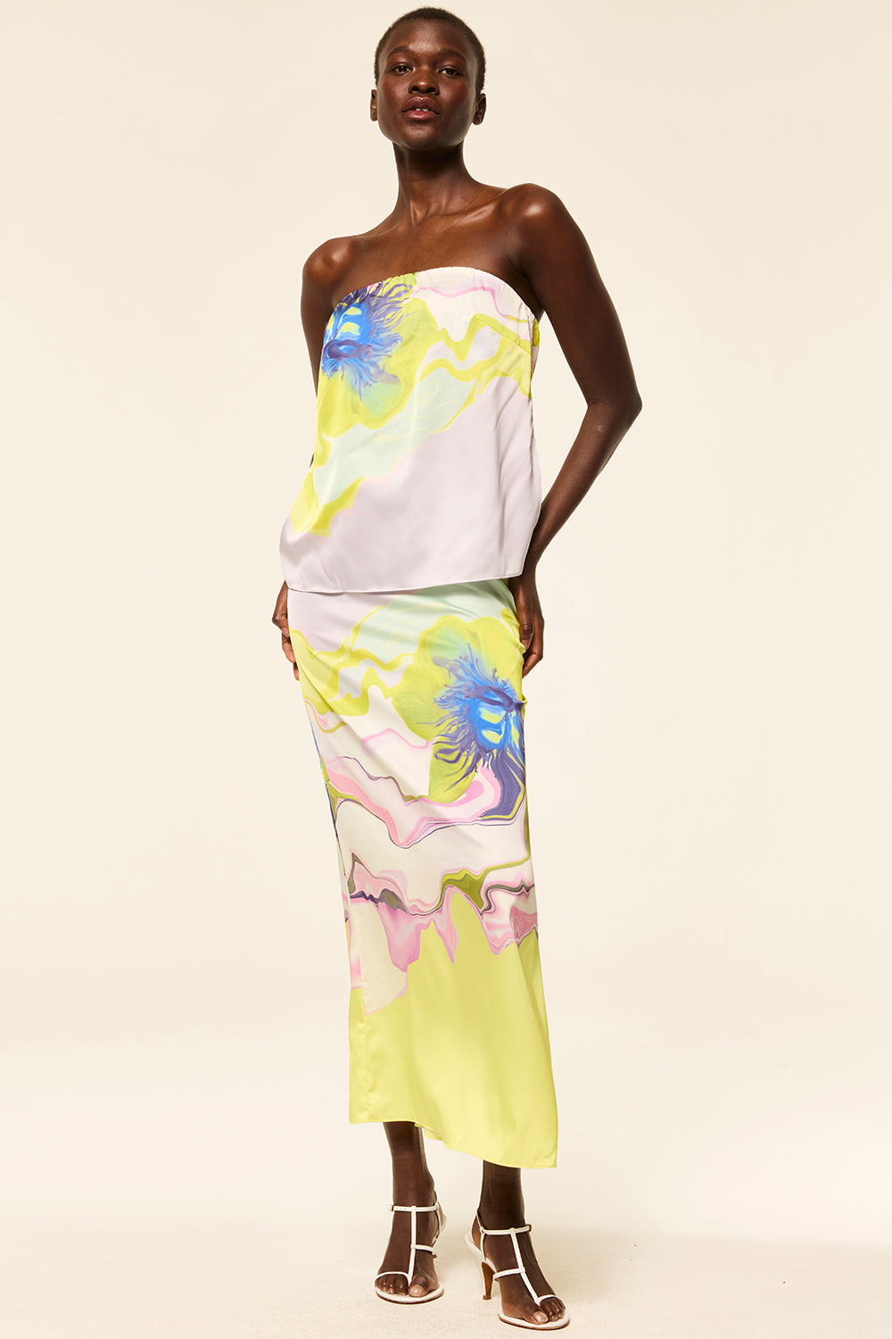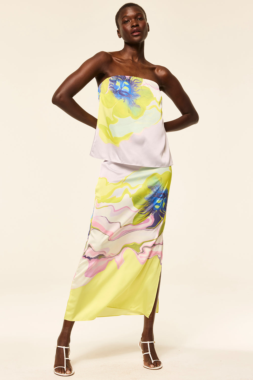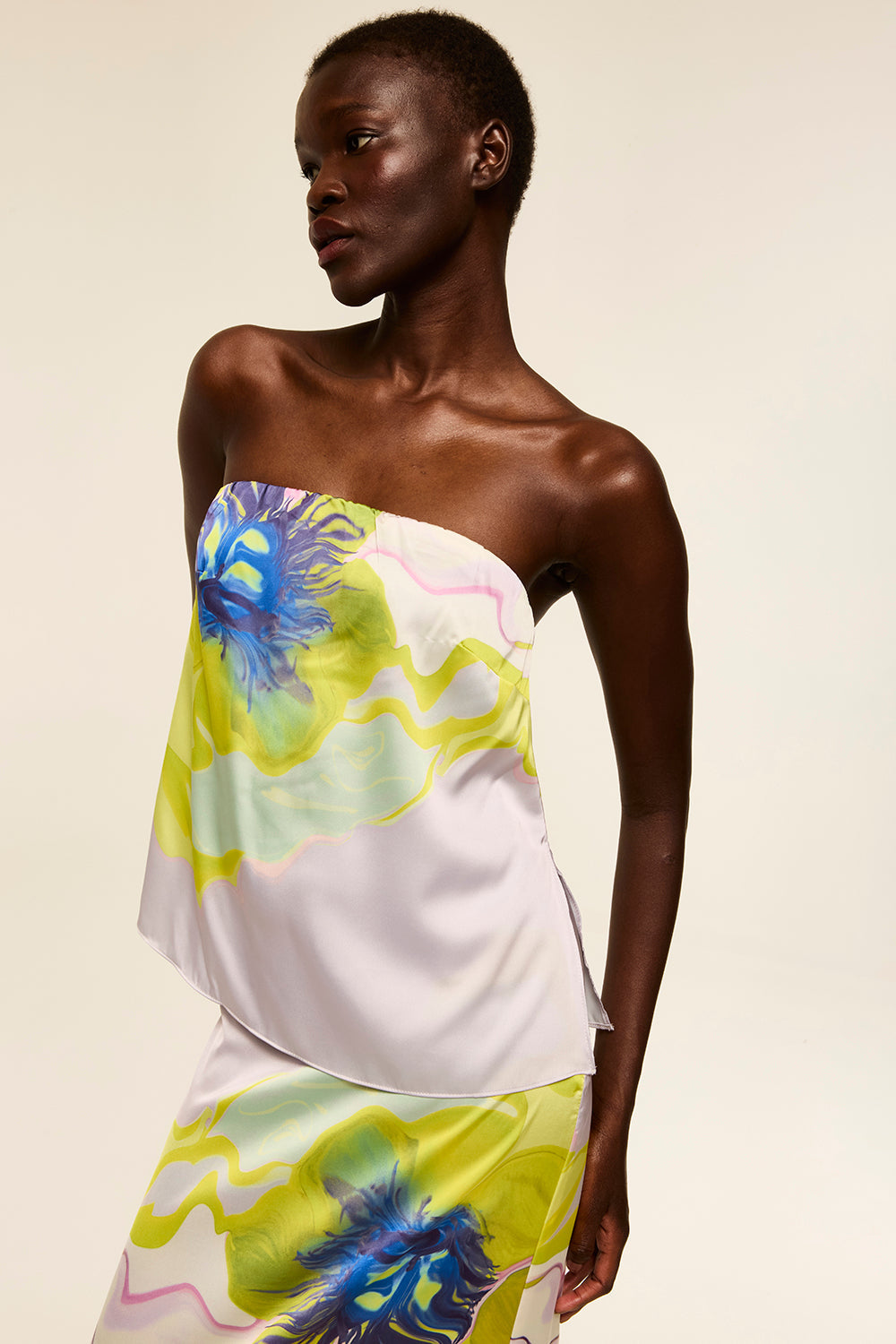 Lyka Is a chic, strapless pull-on top cut from our vibrant Marble Flora printed satin. Featuring covered elastic above the bust that leads into a loose, flowing body with double side-slits. Pair with the coordinating Charli skirt for a sophisticated spring set.