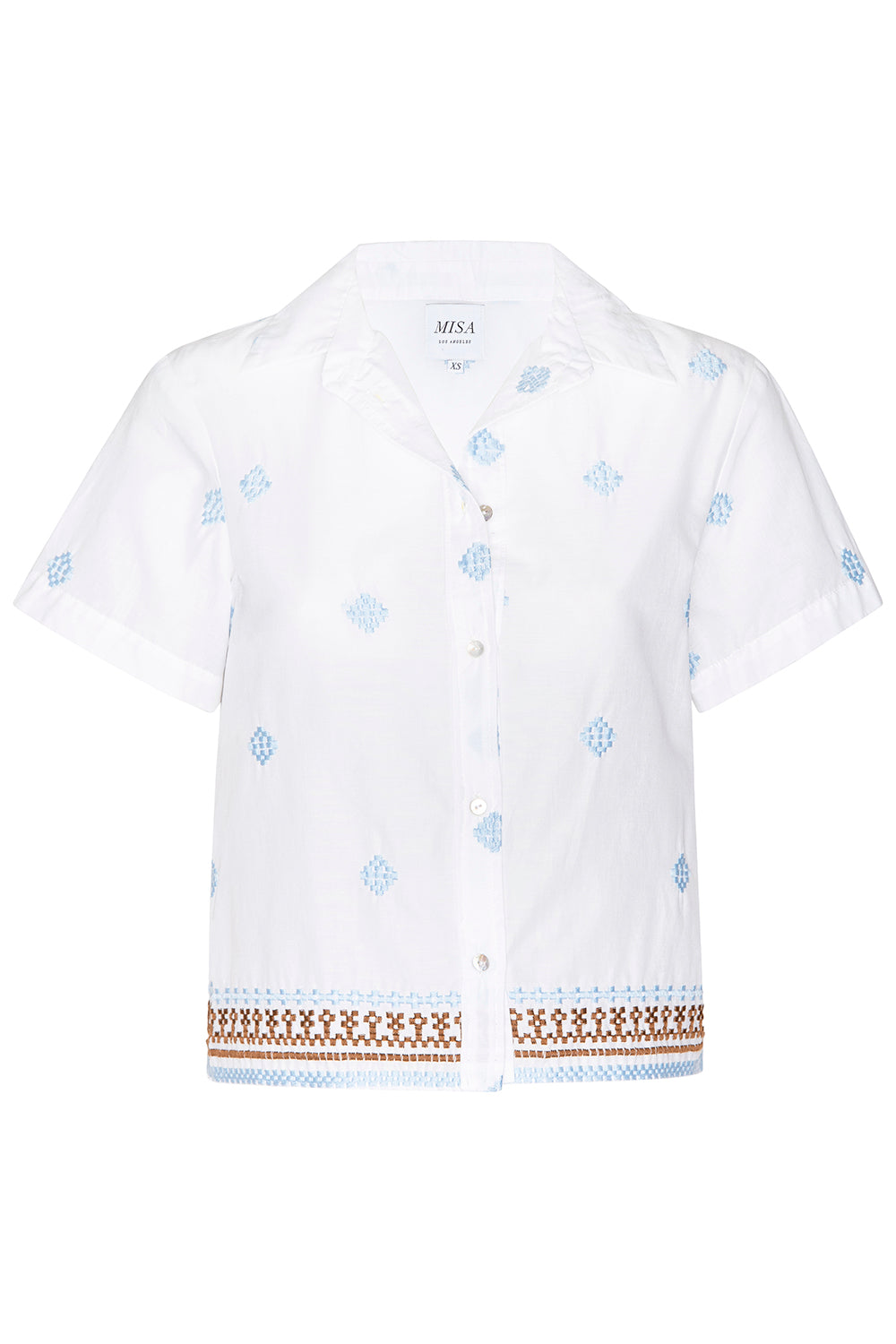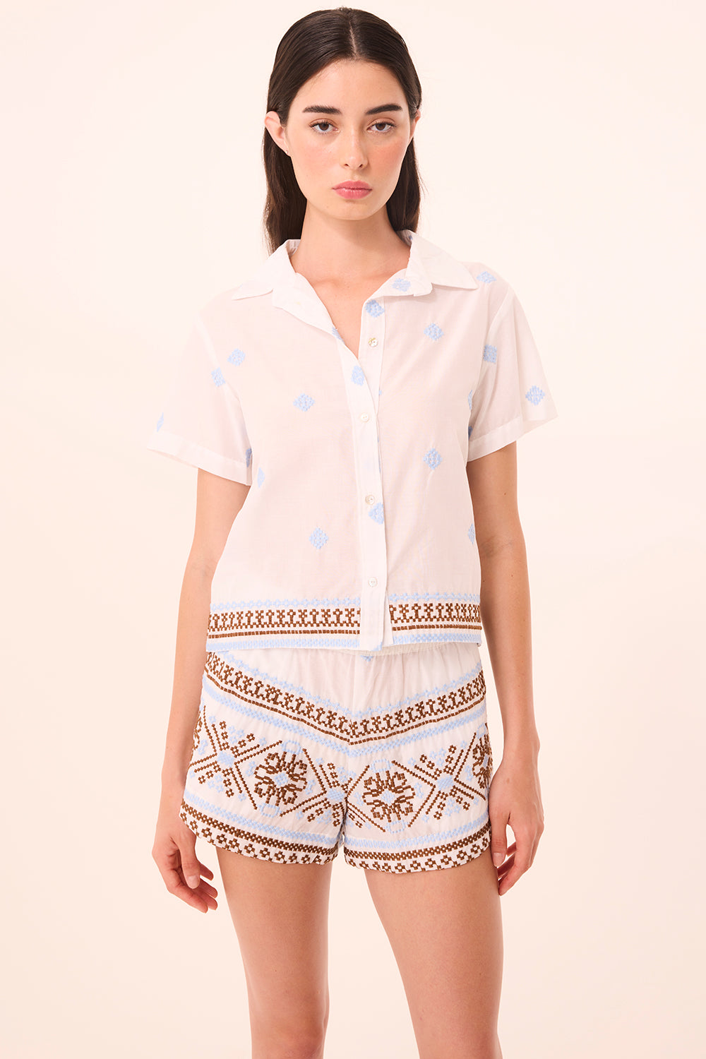 The Magda top is a breezy cotton button-down designed for warm-weather ease. Featuring a fold-over collar, short sleeves, and a hip-length fit, it’s finished with light blue and chocolate embroidery along the hem and a subtle blue embroidered motif throughout. Slightly sheer and lightweight, it pairs perfectly with the coordinating Noah Short for a pack-and-go summer set—ideal for poolside lounging or seaside escapes.