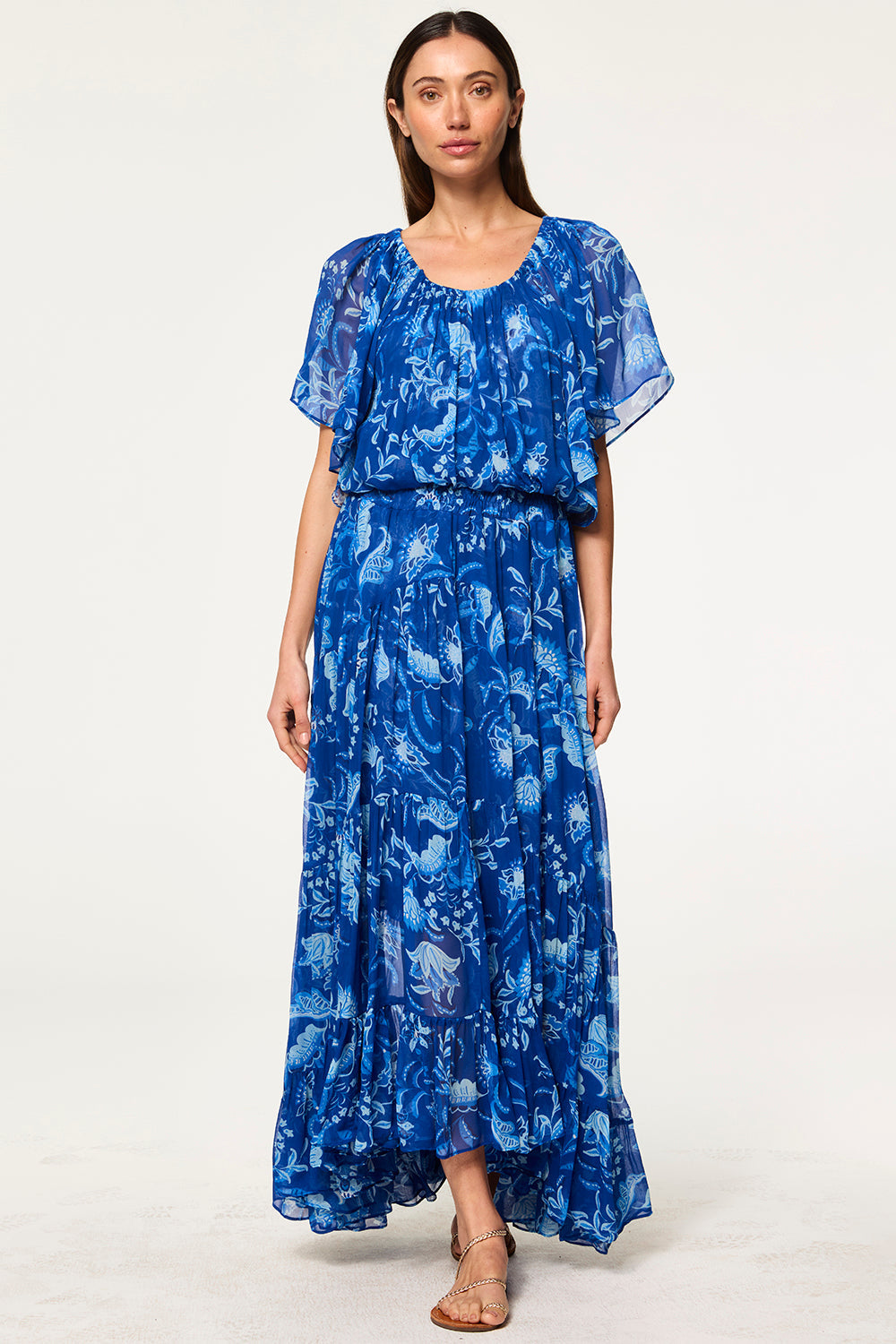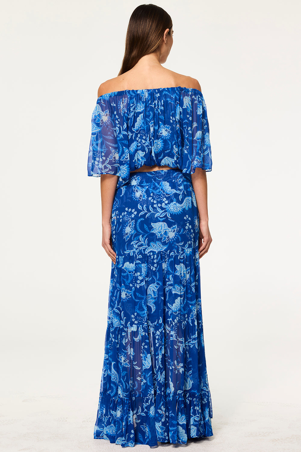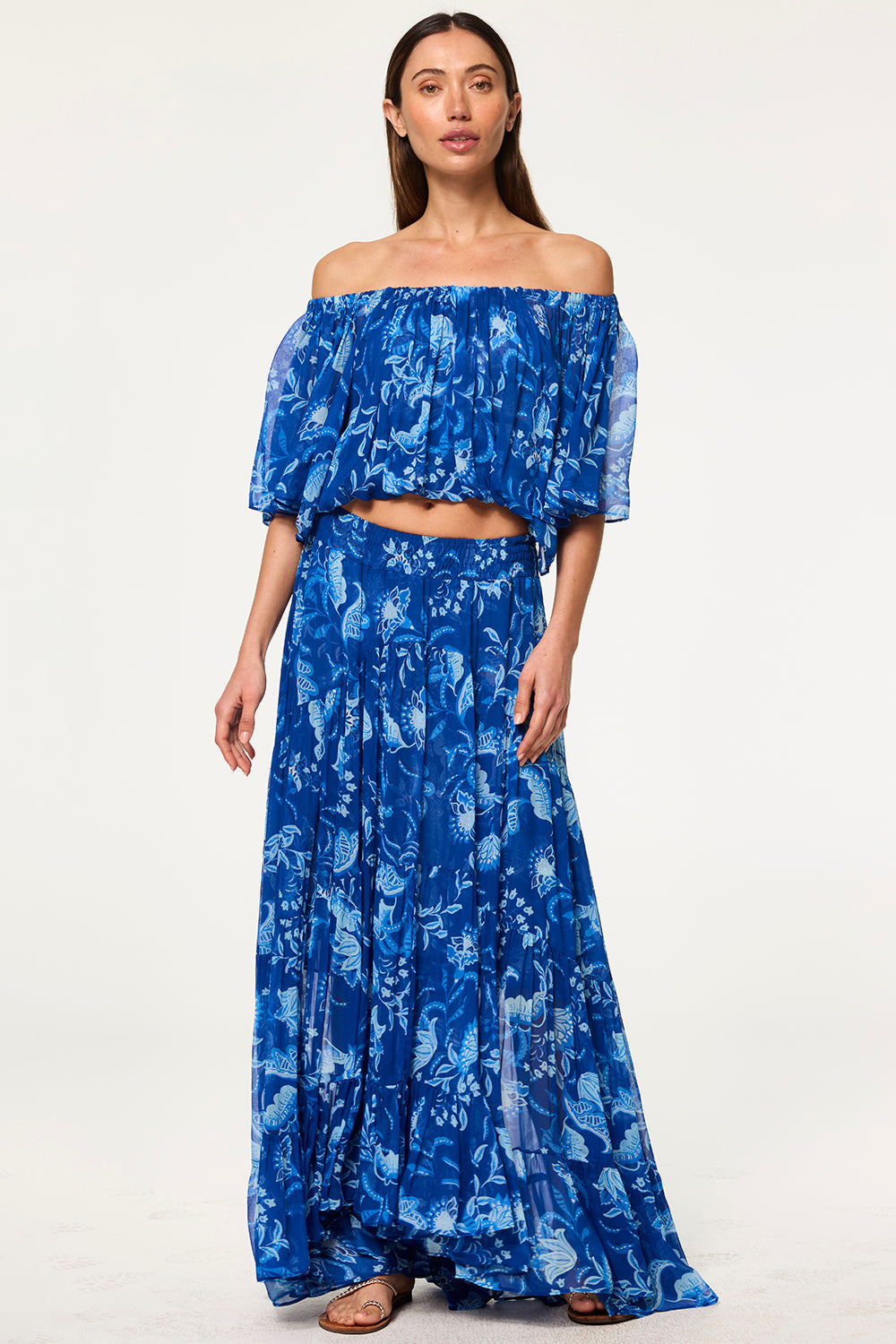 The Marie skirt, a best-selling favorite, returns in an electric blue Fiji Flora–printed chiffon. This classic tiered silhouette is refreshed with an asymmetric hem and features a comfortable elastic waistband and a double-lined slip skirt for easy wear. Pair it with the coordinating Dylan Top for a fresh, versatile look that moves effortlessly from day to night.