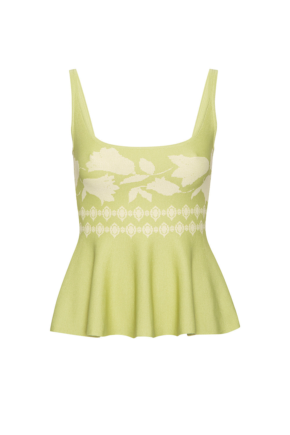 Miley is a fitted peplum silhouette crafted from the same vibrant citron stretch knit jacquard as the coordinating Lexi Short. Featuring a scoop square neckline, thin straps, and a flared peplum hem, this sleeveless style is accented with a tonal motif at the chest and waist. With its flattering stretch and playful shape, it's perfect for creating a fresh, summer-ready set.