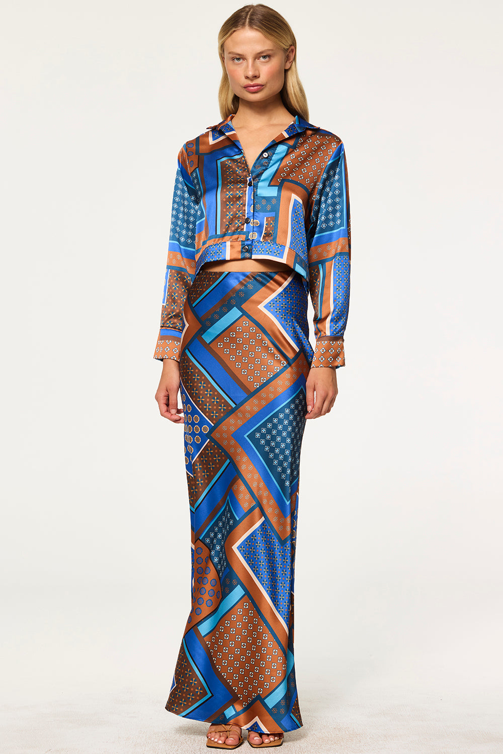 Nadine is a chic cropped shirt jacket in our vibrant Tile Patchwork printed satin with rich brown and electric blue hues. It features a foldover collar, V neckline, button front, and long sleeves with button cuffs. Gathered at the back yoke for a blouson fit and finished with a banded bottom, Nadine pairs perfectly with a white tank and denim or the coordinating Sierra skirt.