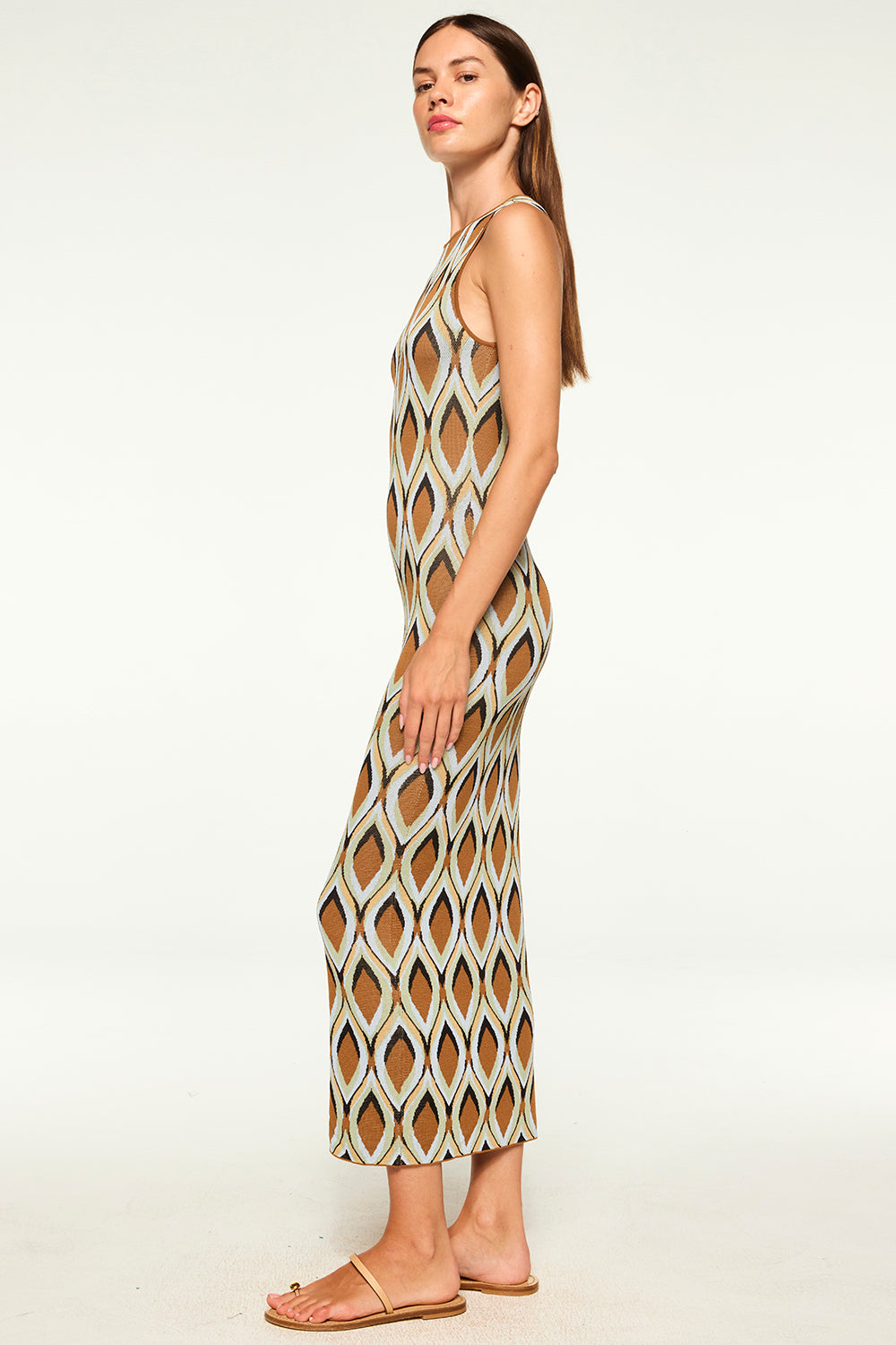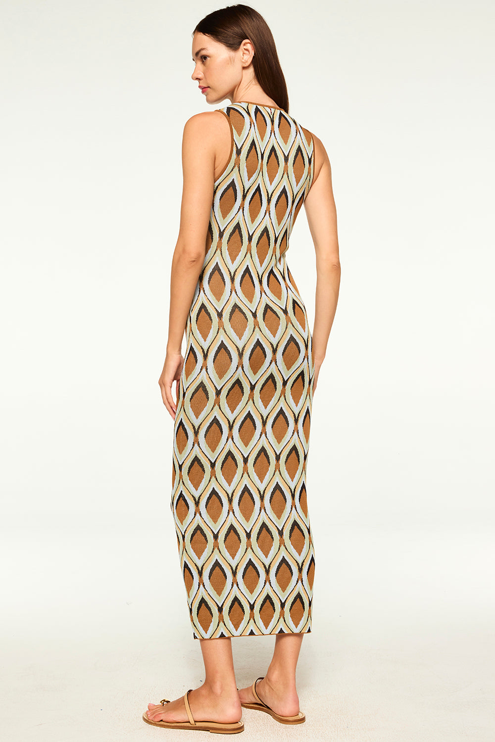 Our best-selling Nakia dress is back in a printed brown mix stretch jacquard knit. This figure-hugging sleeveless silhouette features a high neckline and thigh baring side slit. Pull-on style. Pair with everything from boots and a jacket to flat sandals as the weather warms up.