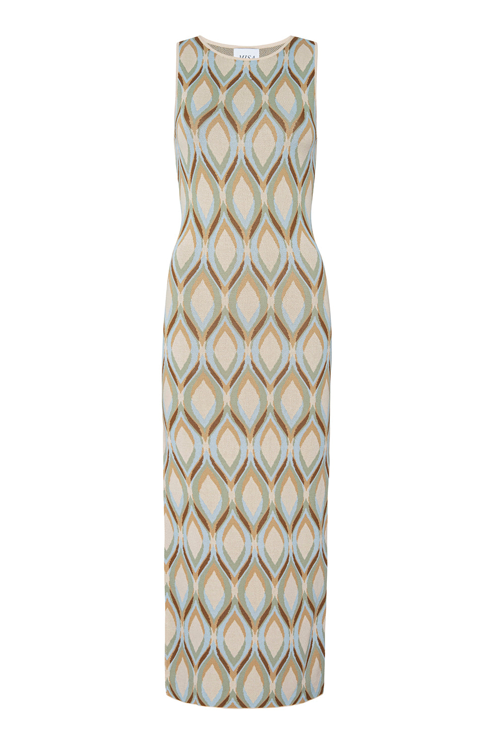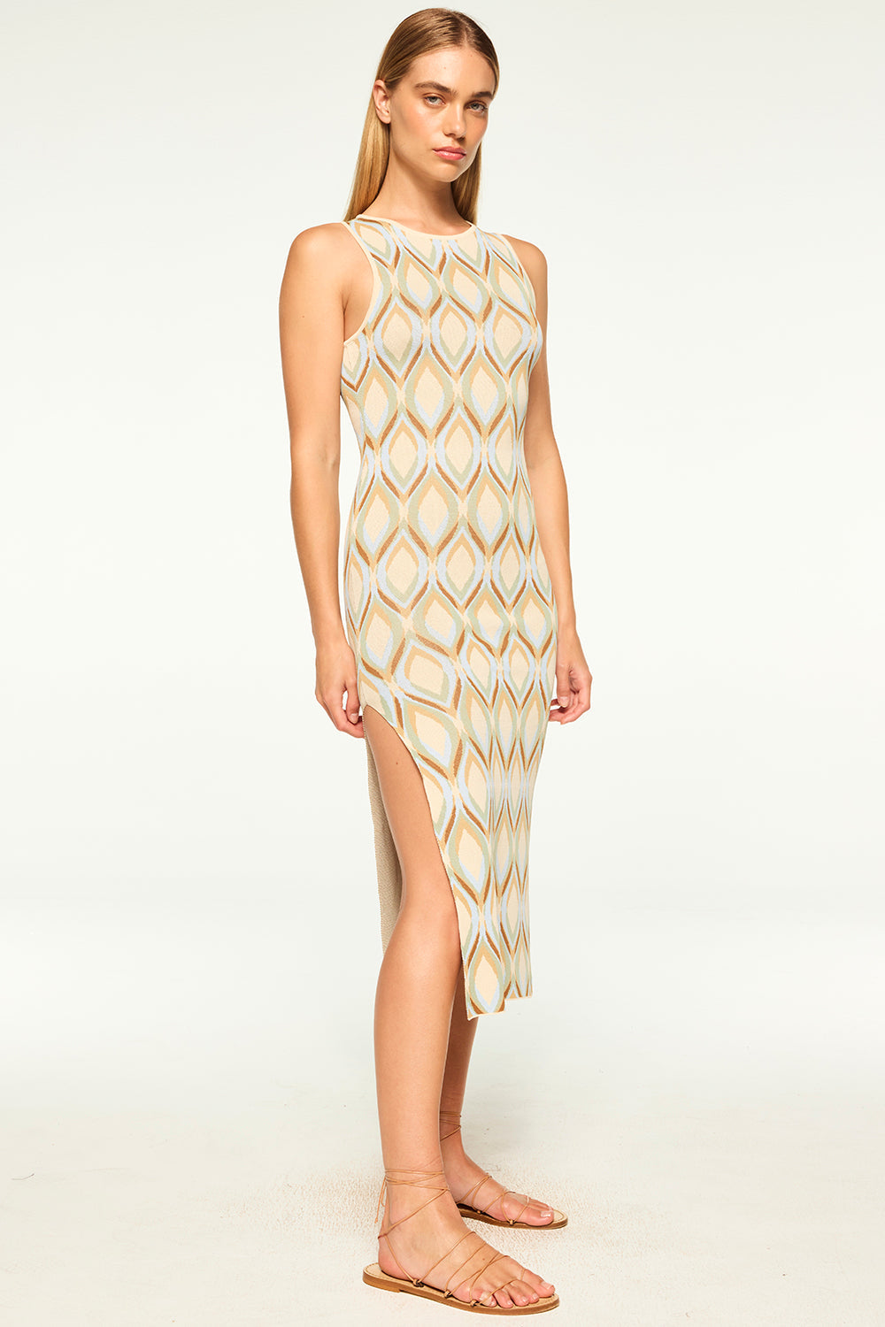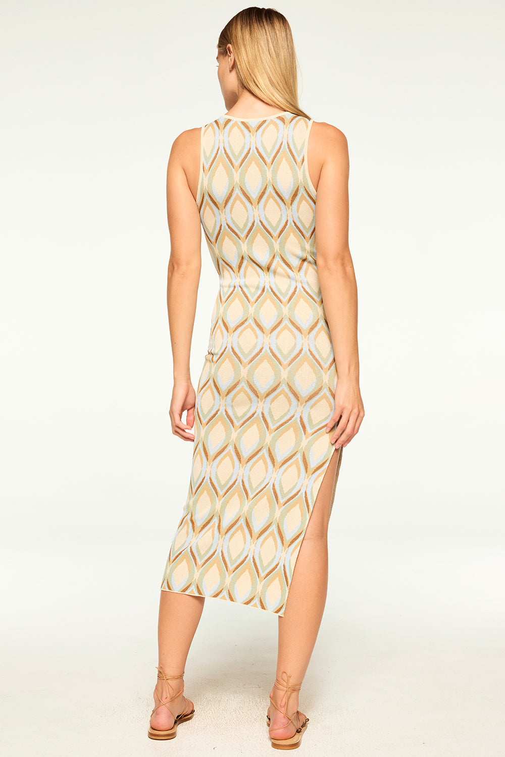 Our best-selling Nakia dress is back in a printed cream mix stretch jacquard knit. This figure-hugging sleeveless silhouette features a high neckline and thigh baring side slit. Pull-on style. Pair with everything from boots and a jacket to flat sandals as the weather warms up.