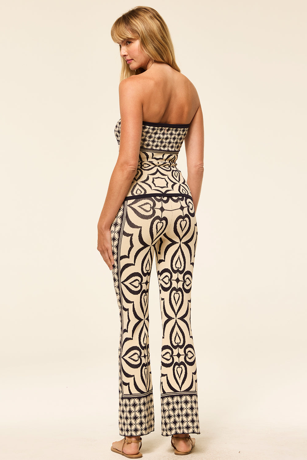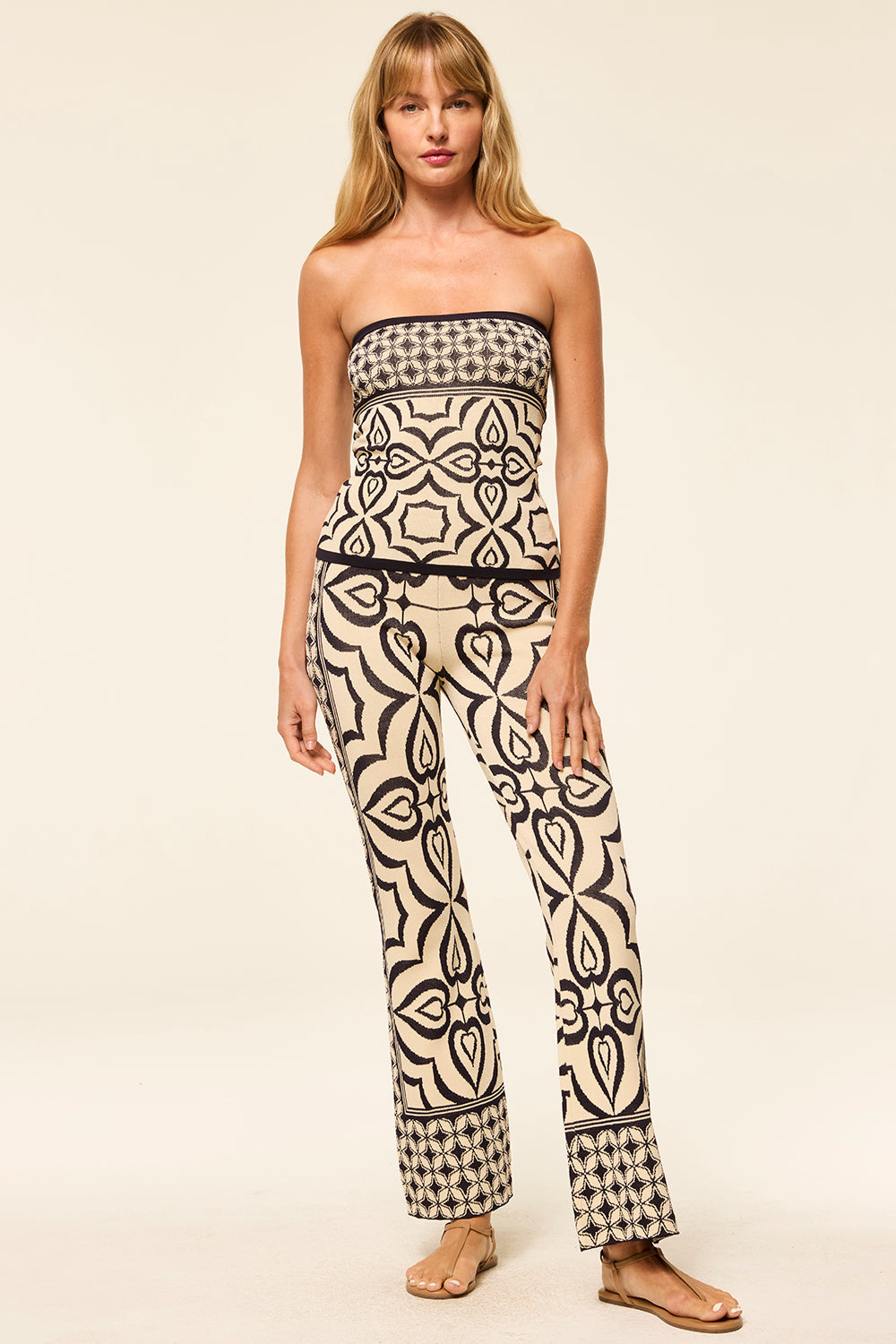 Nessa is a strapless, fitted, knit jacquard top in a navy and ivory mosaic tile print. Style with the coordinating Orla pant to complete the set or pair with your favorite jeans.