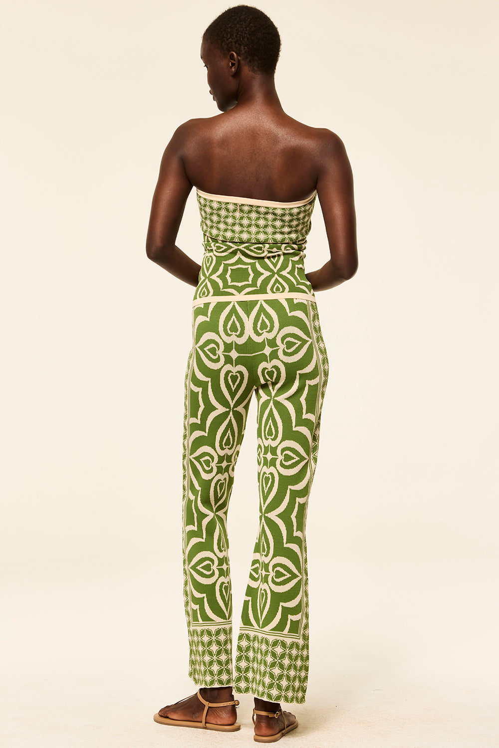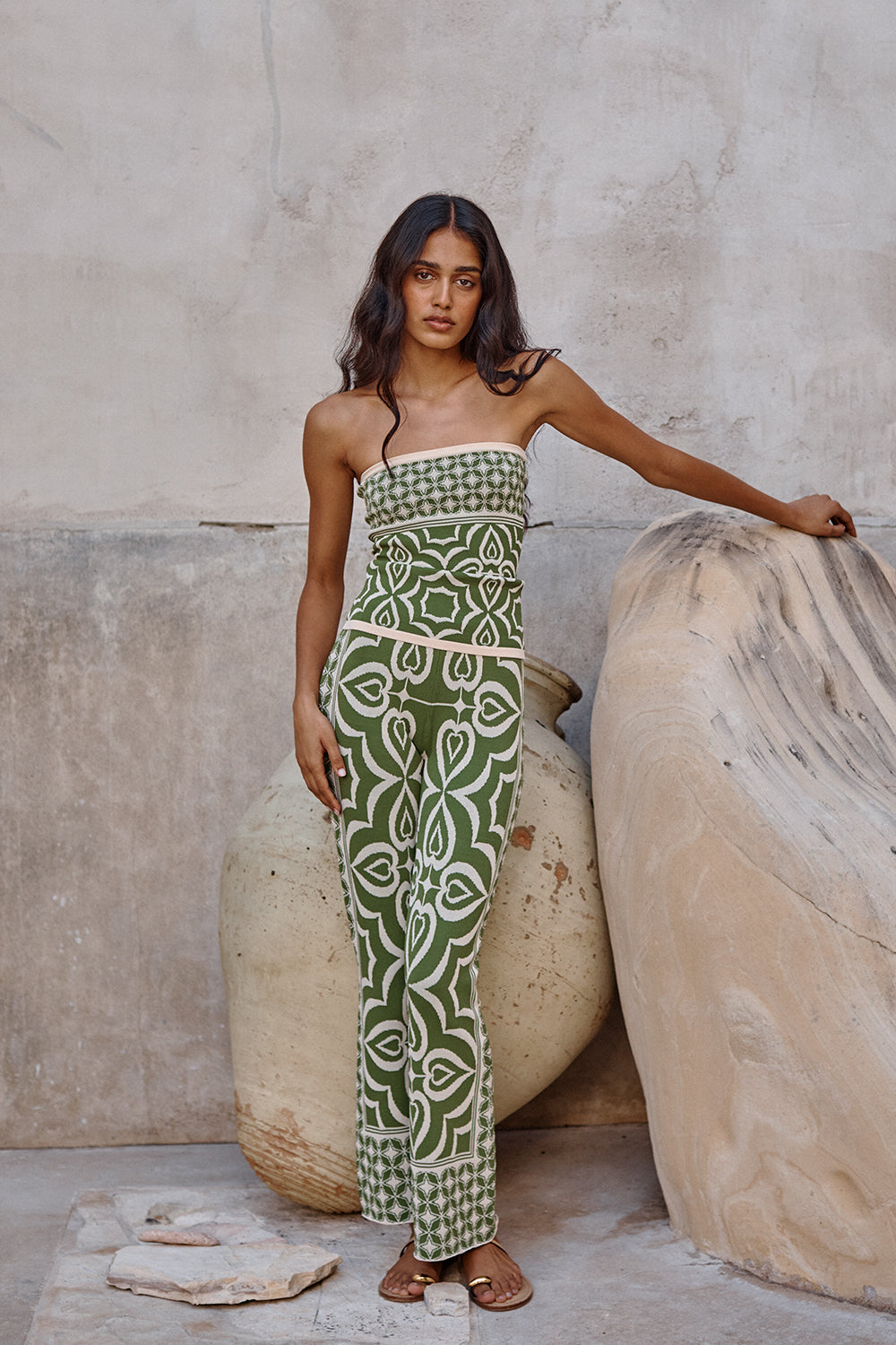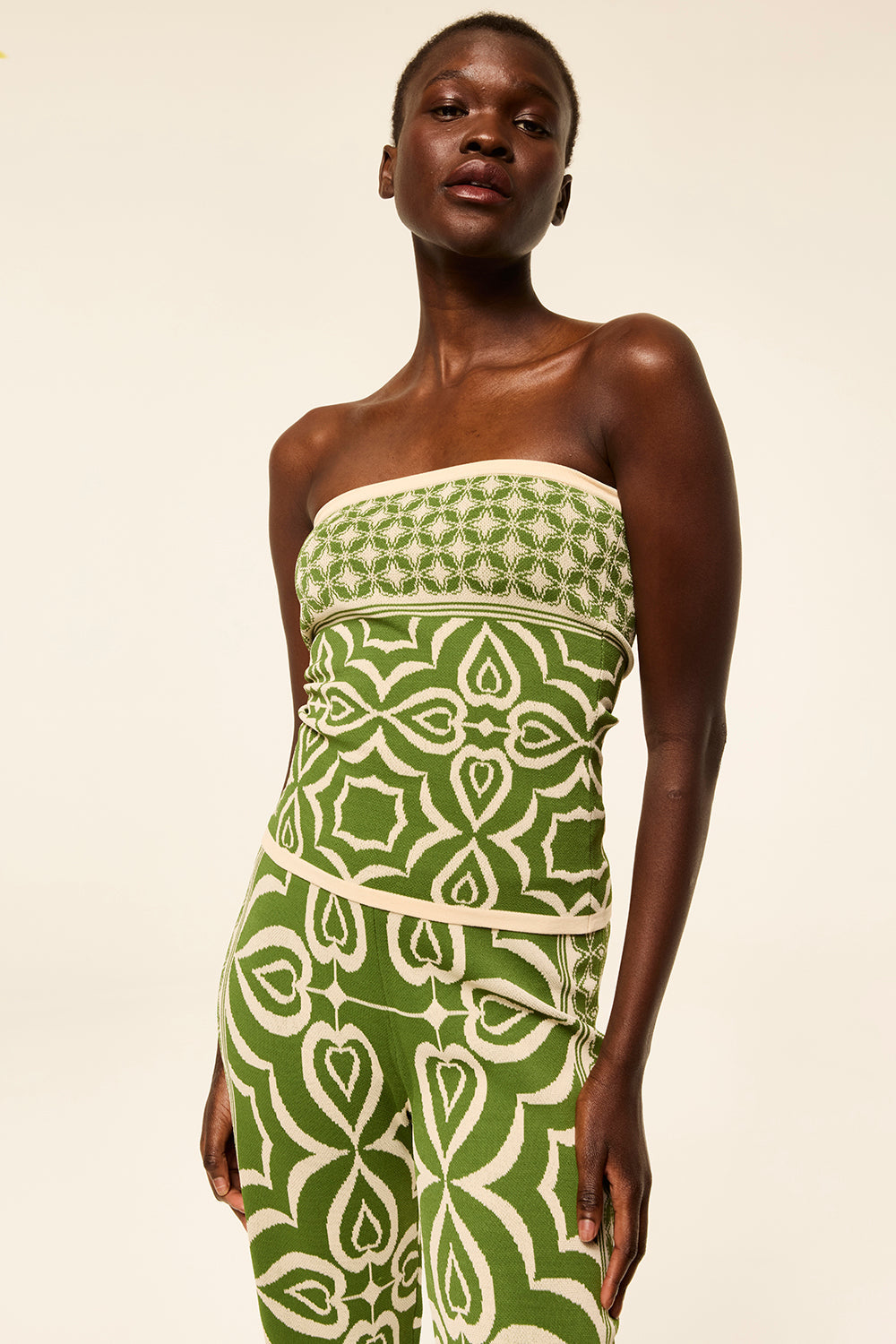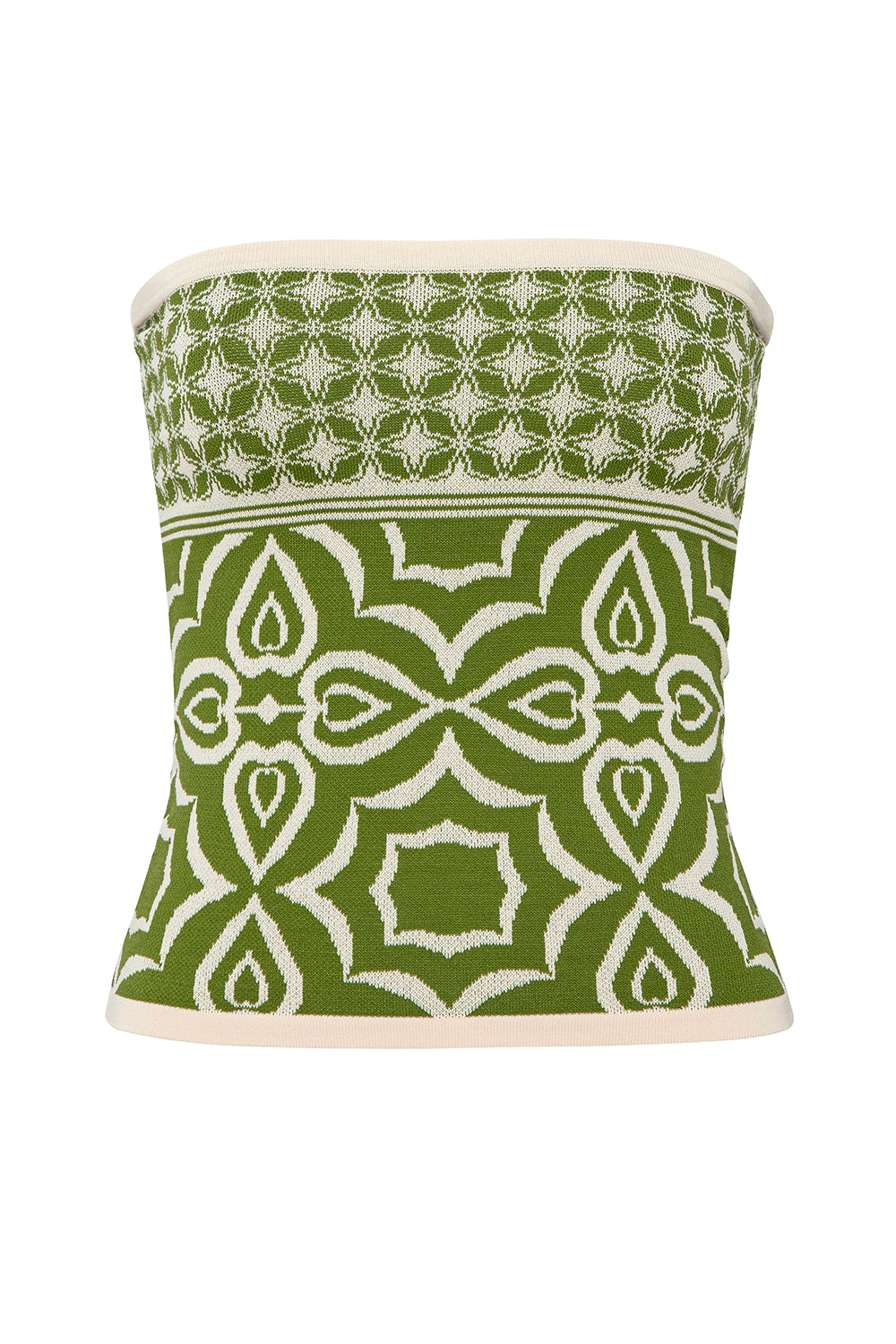 Nessa is a strapless, fitted, knit jacquard top in a spring-ready green mosaic tile print. Style with the coordinating Orla pant to complete the set or pair with your favorite jeans.
