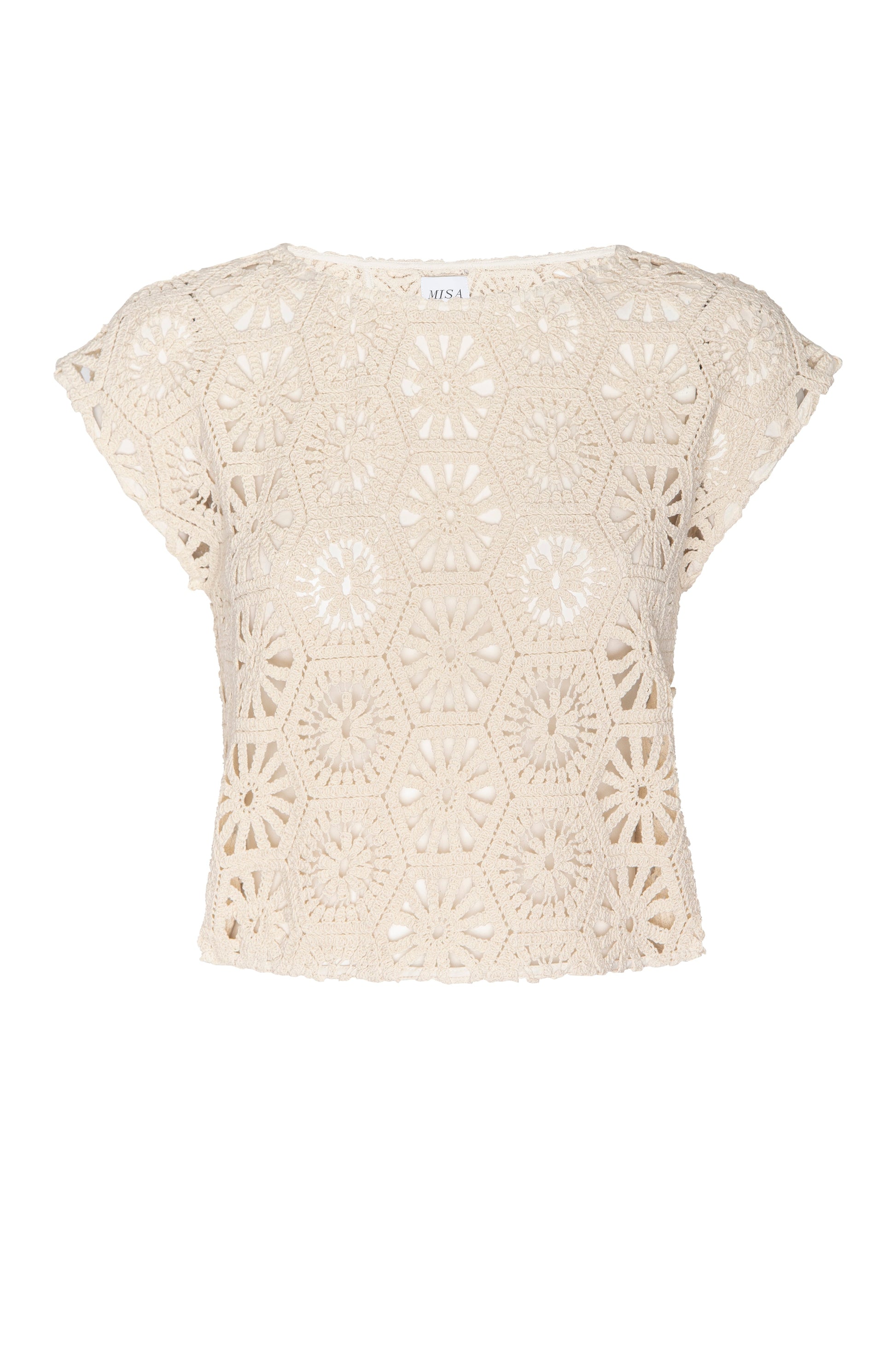 Nissa is a cropped cream crochet top featuring intricate lace detailing and a high neckline with subtly capped, sleeveless openings. Unlined for a semi-sheer finish, this breezy piece is designed with a crossover back and peek-a-boo opening. Pair with the Terra pant for a perfect pack-and-go vacation set, or style with easy linen trousers for a relaxed look.