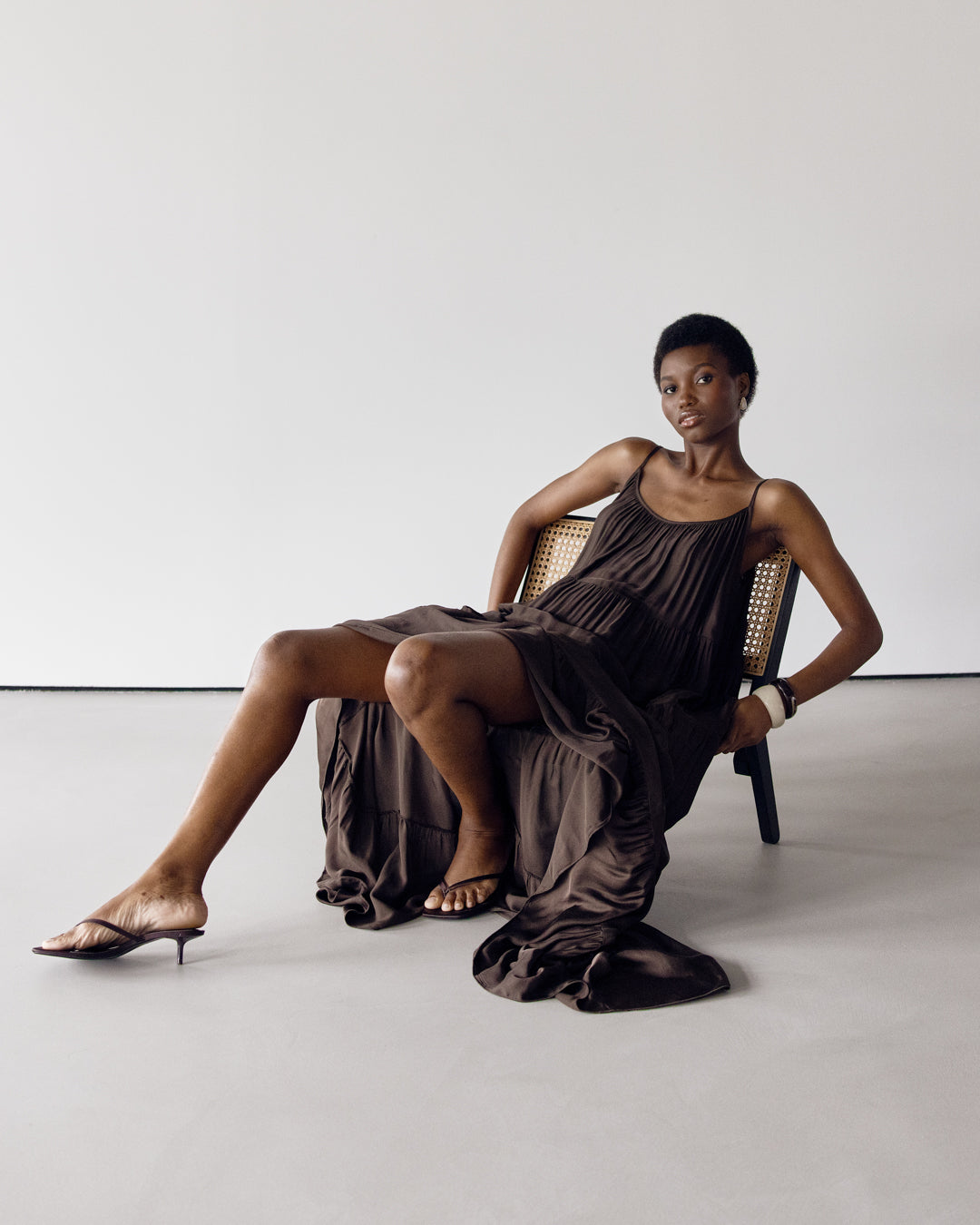 Noelle Strappy Tiered Satin Maxi Dress | Cocoa Soleil