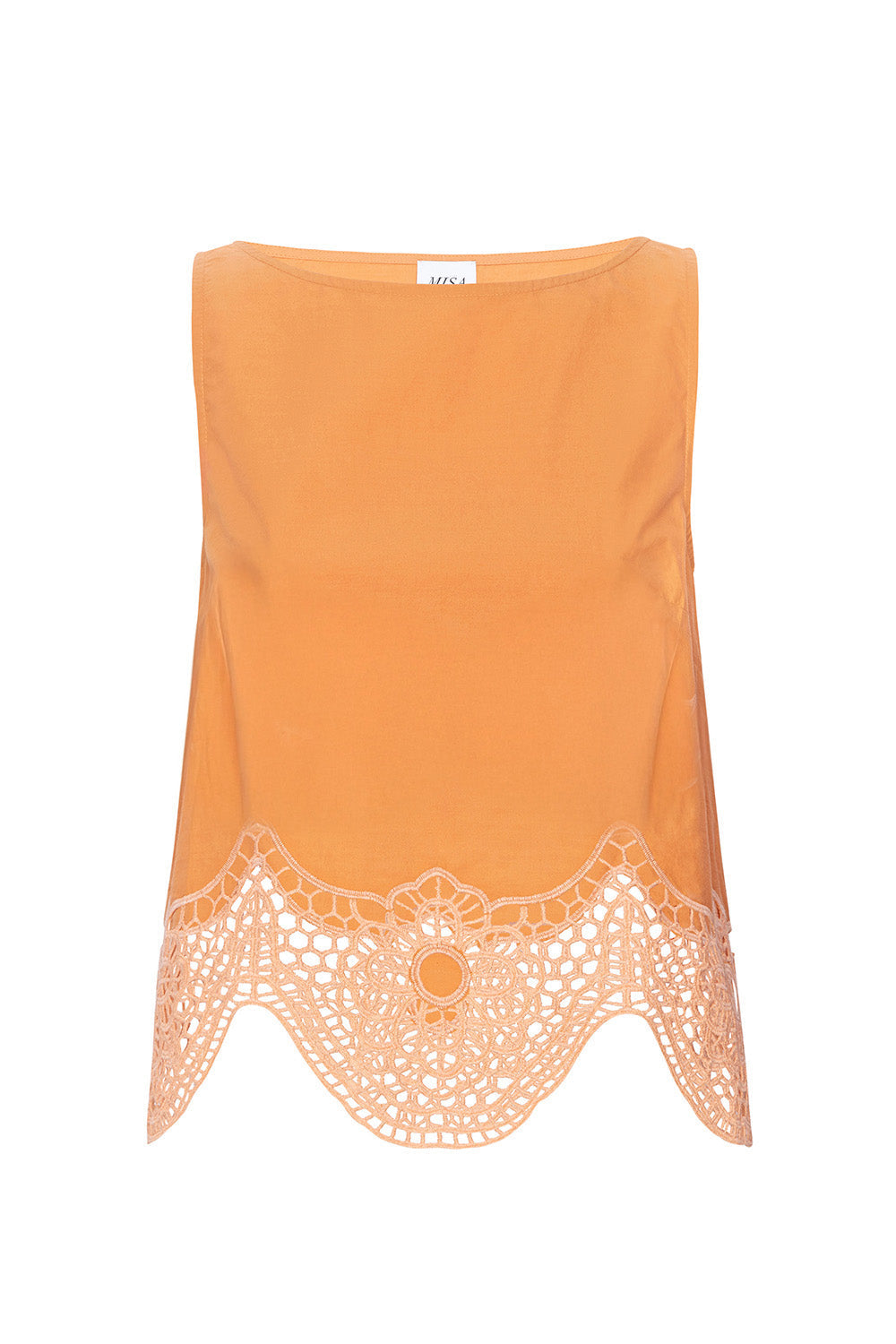 Nola is a fresh new style in a vibrant apricot embroidered cotton. Sleeveless with a high boat neckline, this feminine spring style features ivory embroidered lace details at back and hem. Pair with the coordinating Ayana skirt for the perfect set.