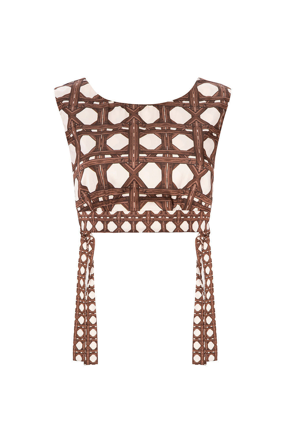 Olena is a standout piece from our Spring collection. This tailored crop top is cut from gorgeous Chocolate Rattan print satin and features a high neckline and v back. Side cutout with a smocked stretch band. Trimmed with a smaller scale print and bow details with hidden button closure. Pair with the coordinating Rita pant for a memorable spring set for your next soirée.