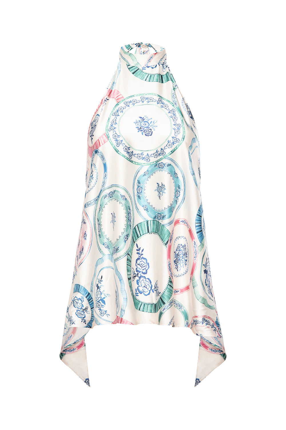 Ora is an asymmetric halter-style scarf top cut from our Prismatic Plates–motif satin. This effortless silhouette features a double tie-back and an elasticized band for a secure fit, allowing it to be worn loose and open with ease. Pair it with the coordinating Reshma Pant for a chic, modern summer set.