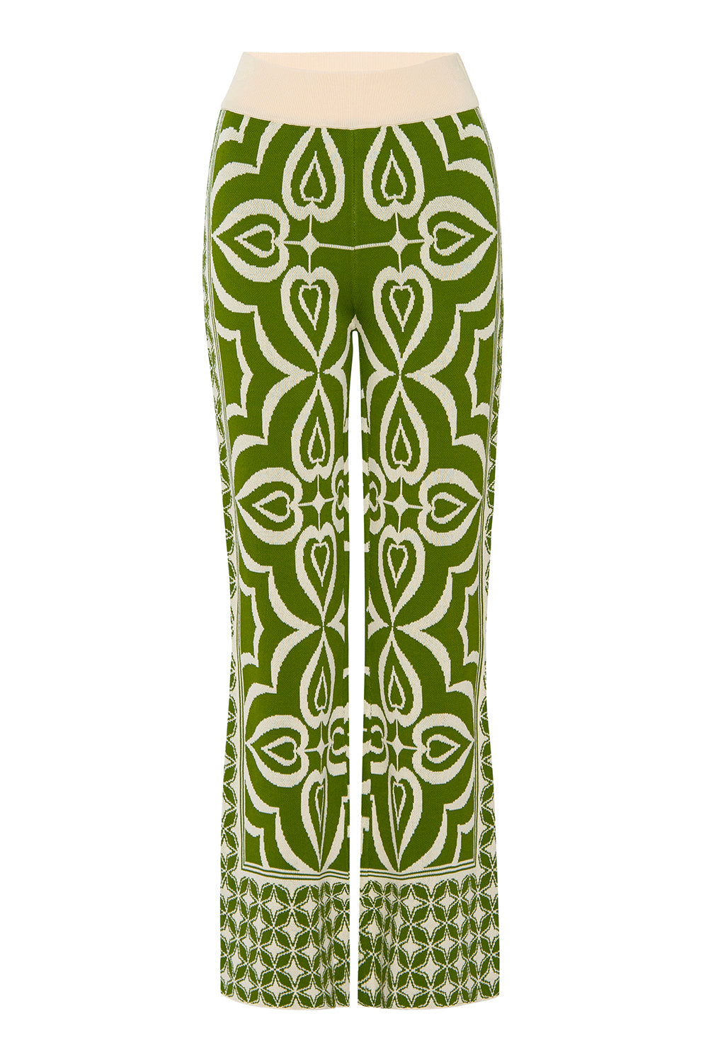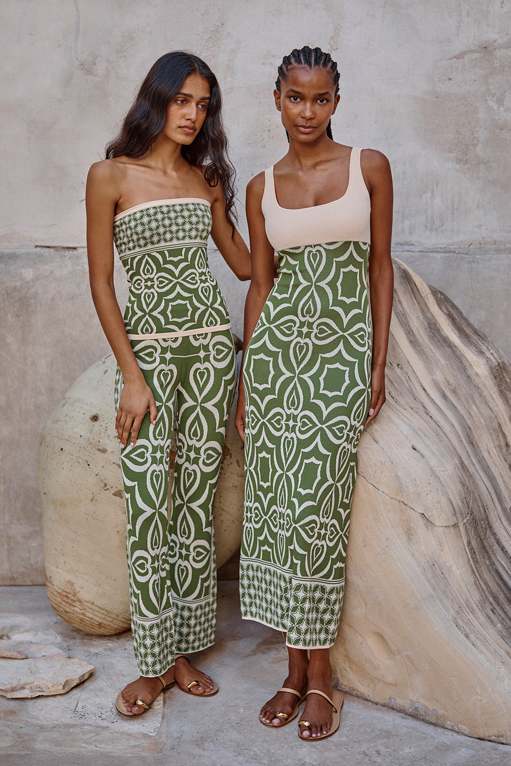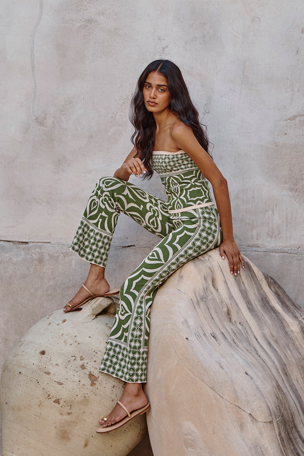 Orla is a flattering stretch knit jacquard pant in a green mosaic tile print. This slightly flared fitted style features a solid ribbed knit waistband for a flattering fit. Pull-on style. Pair with the coordinating Nessa bandeau and Pansy cardigan for a spring-ready three-piece set.