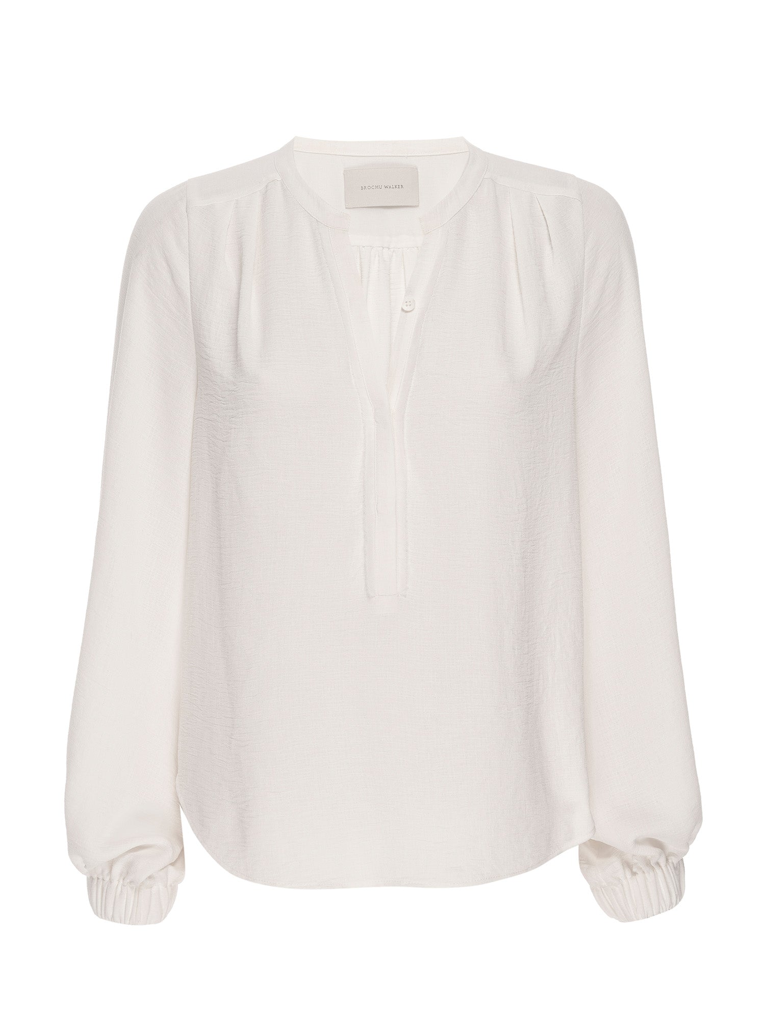 New popover silhouette with Brochu Walker signature details. Designed to be slightly oversized and flowy, our Phoebe Blouse is the epitome of feminine modernity. It features a sensual, pleated shoulder detail, hidden-button placket with contrast georgette, raw-edged trim, and billowy, elastic cuffed sleeves for added boho-chic. In a new Italian creped fabric, it is effortless perfection.