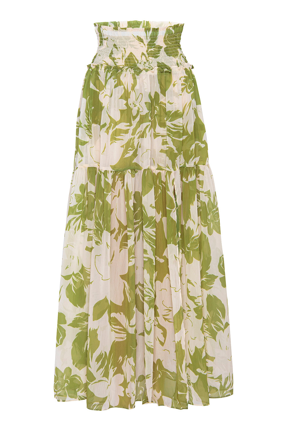 Our Polly skirt is an effortless staple cut from our spring-ready Green Goddess printed chiffon. This maxi style features a wide smocked elastic waistband that leads into a flowing skirt with a front slit that starts above the knee. Pair with the coordinating Adah top for the perfect set.