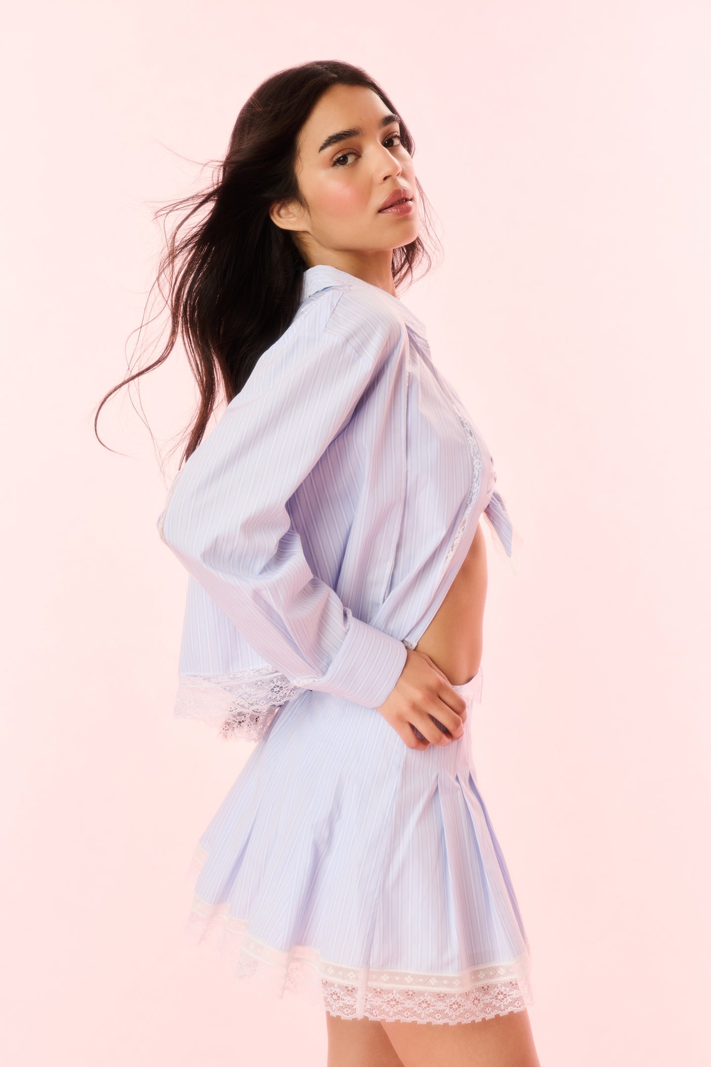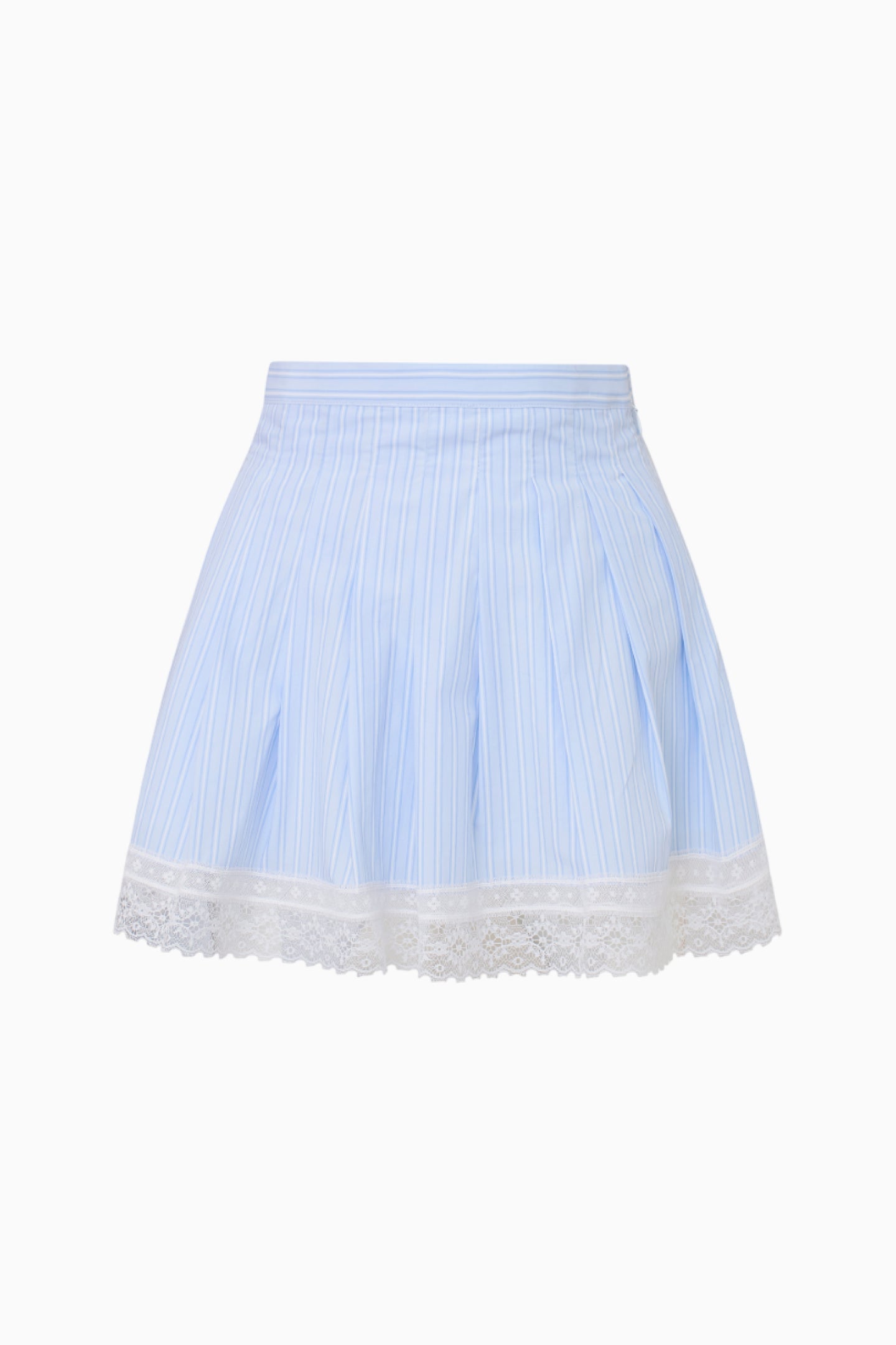 Put on the pretty with the Portman Skirt. The mini debuts with a crisp poplin fabric with strips of vintage-inspired laces. This pleated skirt begins with a fixed waist and pellets stitches down the piece that releases at the hip area. The gorgeous mini is finished with a delicate lace arrangement and a structural silhouette with a zipper to make it a fuller looking piece. Pair with the Arvine Top or Delano Top for a full set.