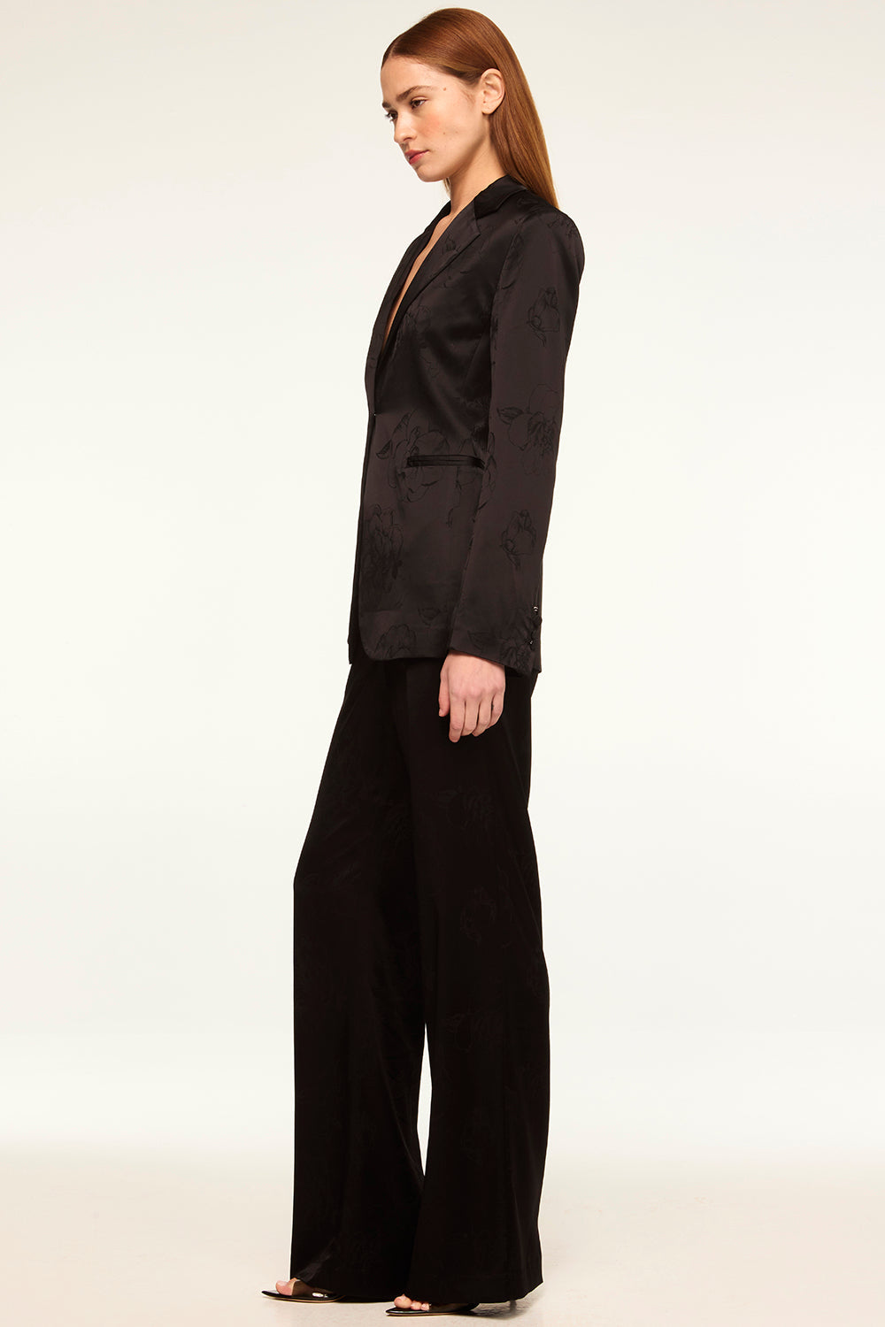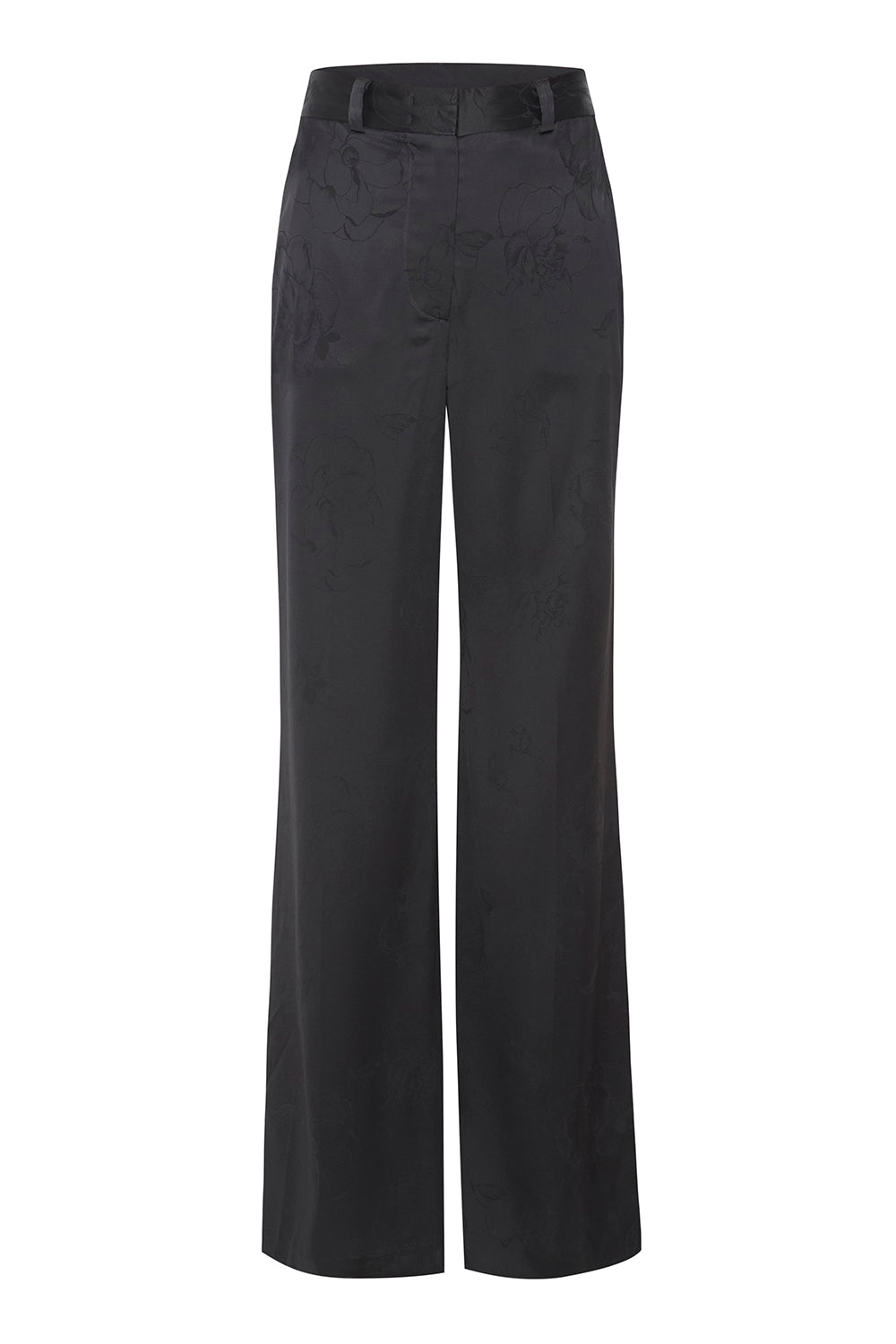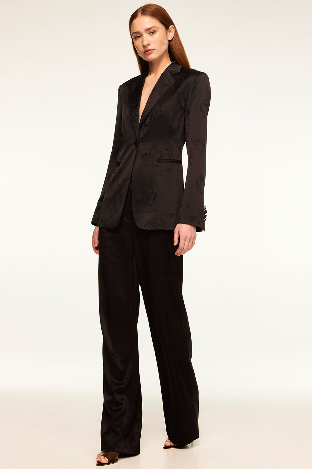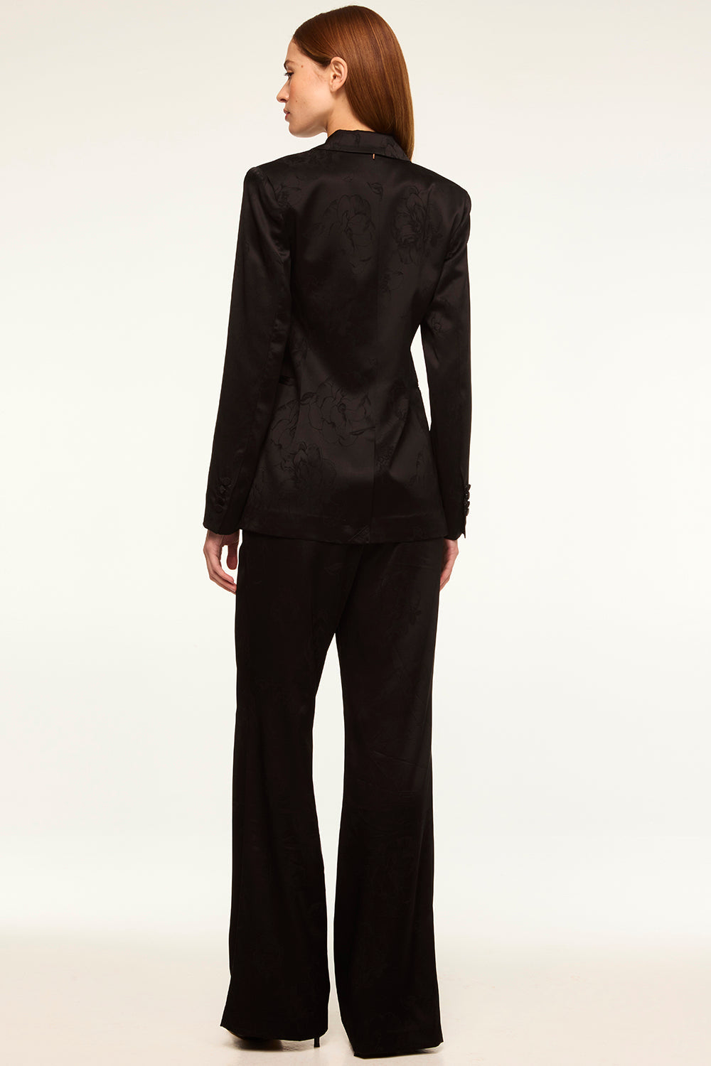 The Remi pant is cut from a black satin jacquard with floral tonal detailing throughout. These perfectly tailored pants feature a high rise and slightly flared leg. Banded waist with belt loops, zip fly and button tab closure. Complete the look with our coordinating Lauren blazer.