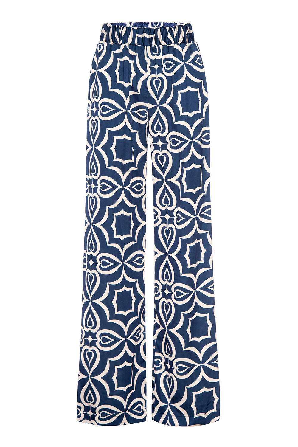 Our Reshma pant is an easy day to dinner silhouette cut from a Blue Mosaic Tile-printed satin. Easy wide legs with side slit pockets. A covered elastic waistband. Pair with your the coordinating Teodora top.