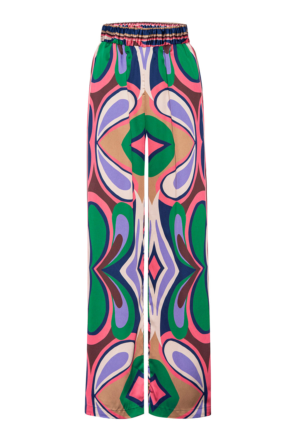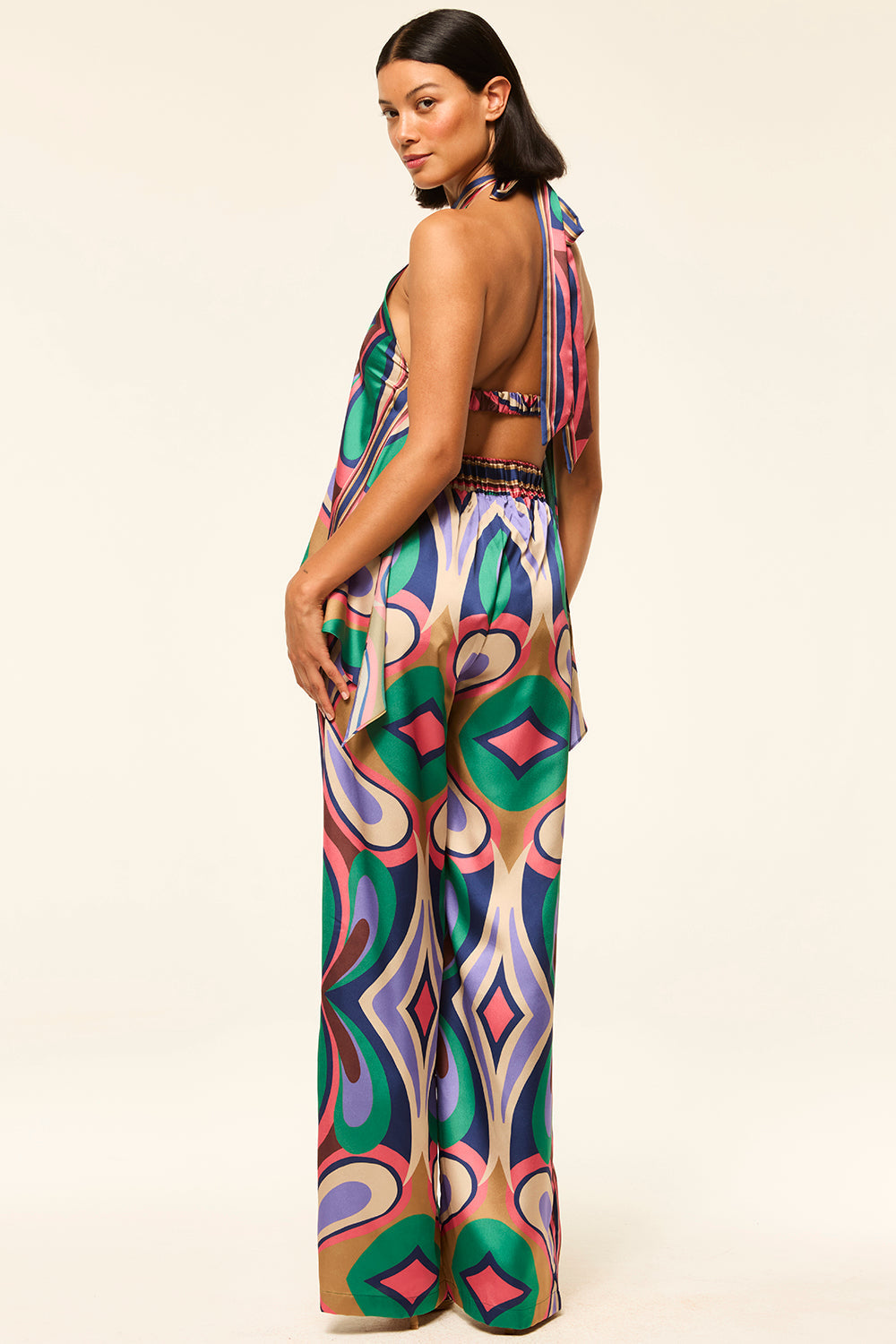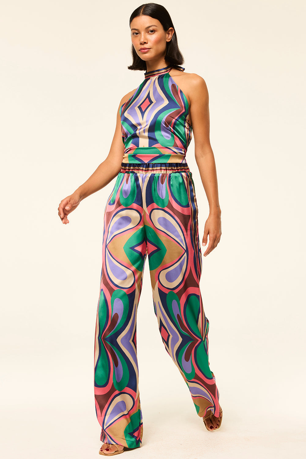 Our Reshma pant is an easy day to dinner silhouette cut from a vibrant Butterfly Mirror-printed satin. Easy wide legs with side slit pockets. A covered elastic waistband. Pair with your favorite tee or with the matching Ora or Solange tops.