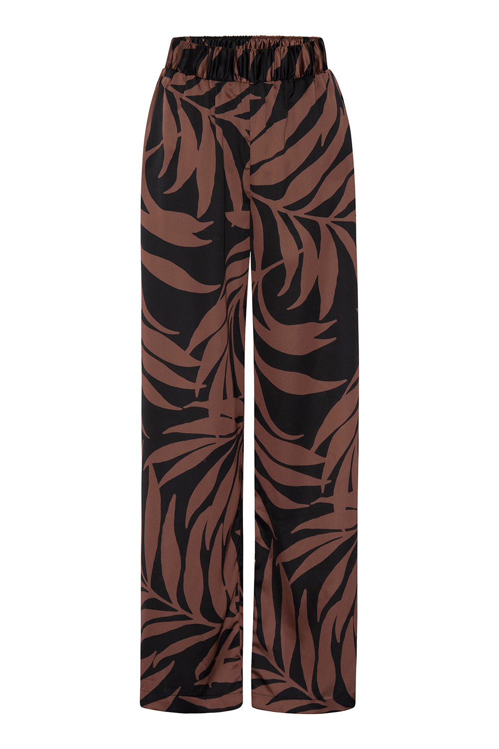 Our new Reshma pant is an easy day to dinner silhouette cut from a lovely chocolate and black Palm Frond printed satin. Easy wide legs with side slit pockets and a covered elastic waist. Pair with your favorite tee or with the matching Aylin top.