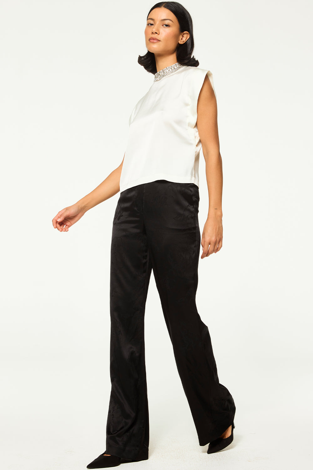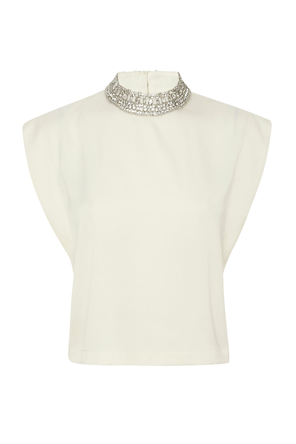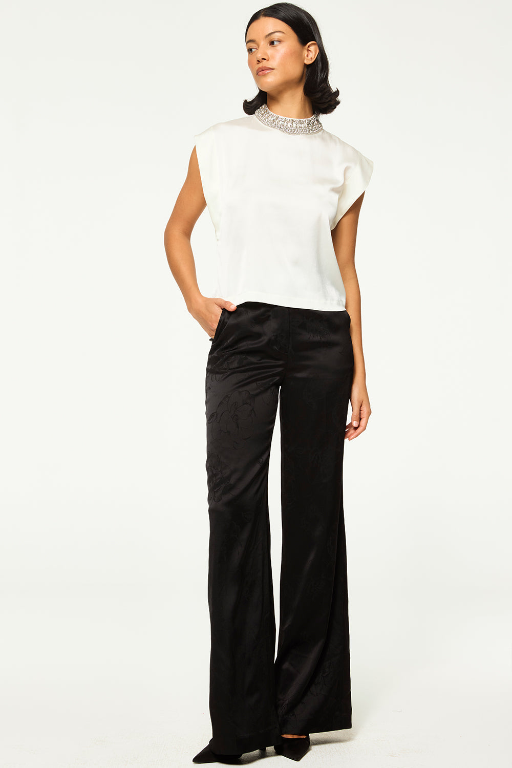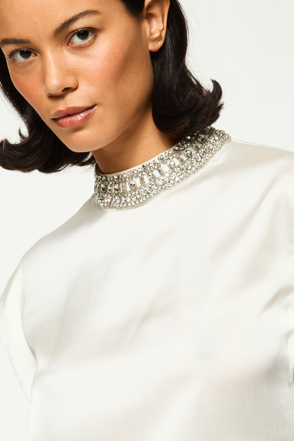 Just in time for the holidays, our new Riley blouse in ivory satin features a luxe crystal-embellished collar and high neckline. Flared cap sleeves and a single keyhole back closure. Hits right at the hip with a flattering relaxed flit. Dress this fête-ready style up with our satin jacquard Remi pant or pair with your favorite wide leg jeans for an effortlessly chic daytime to dinner look.
