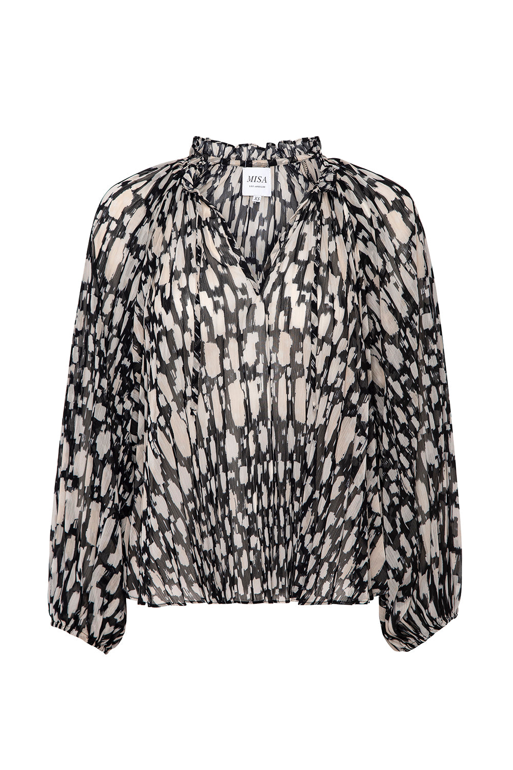 Rissa is an easy bohemian-inspired silhouette cut from our black and white Abstract Geo printed chiffon. A split v-neckline with adjustable ties and long blouson sleeves with elasticated cuffs. Semi-sheer. Pair with your favorite denim or the coordinating Ilona skirt.