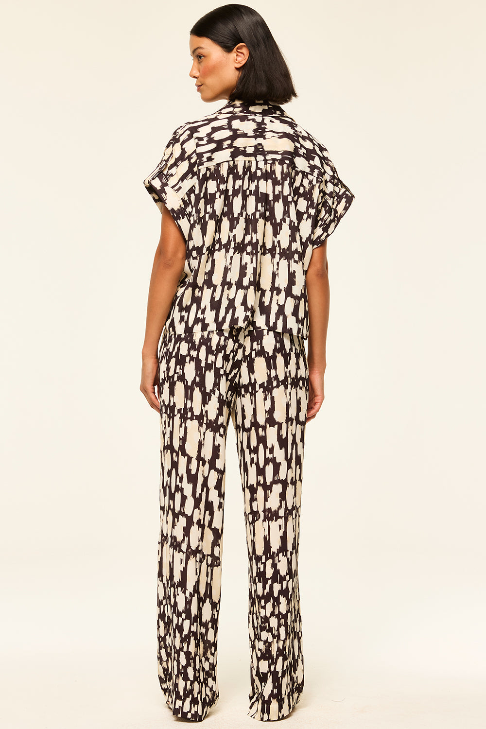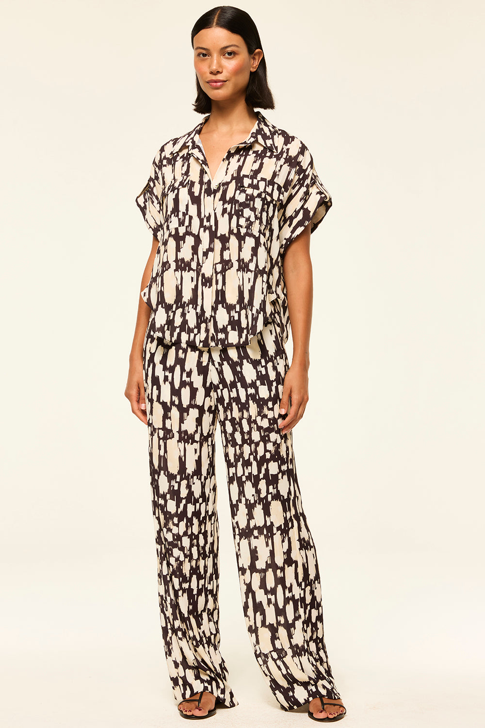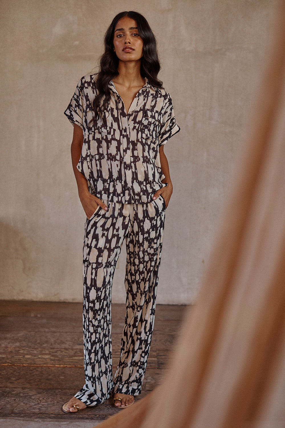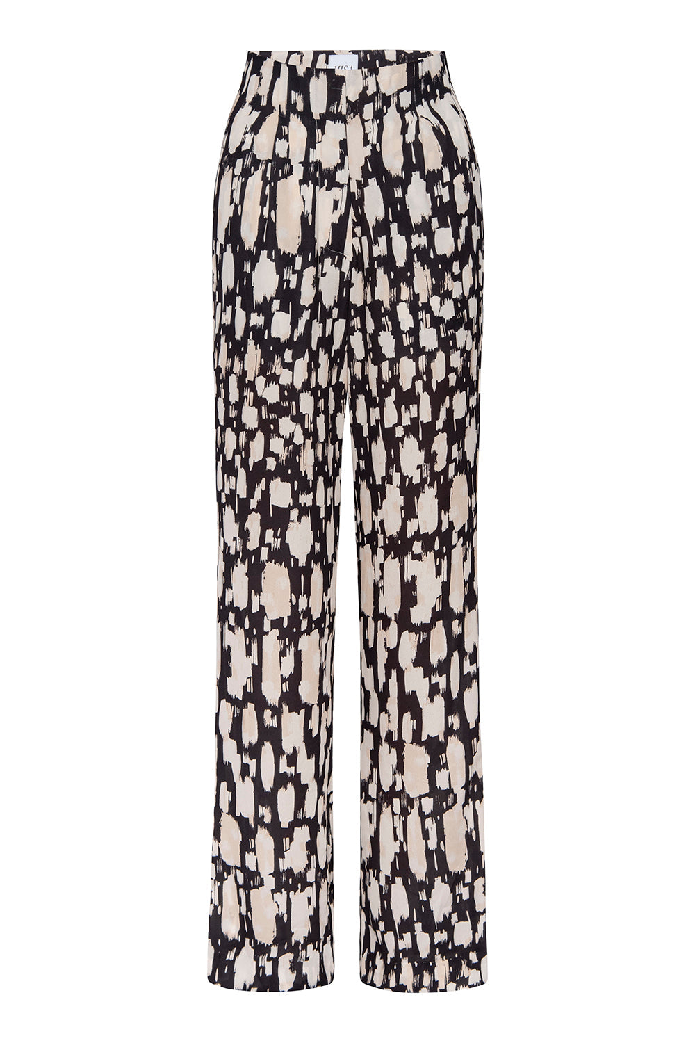 Our high-rise Rita pant is cut from a black and white Abstract Geo crepe. Featuring straight legs and side slant pockets. A hidden zip front and extended hook-and-bar closure. Pair with the coordinating Erin top for a chic set.