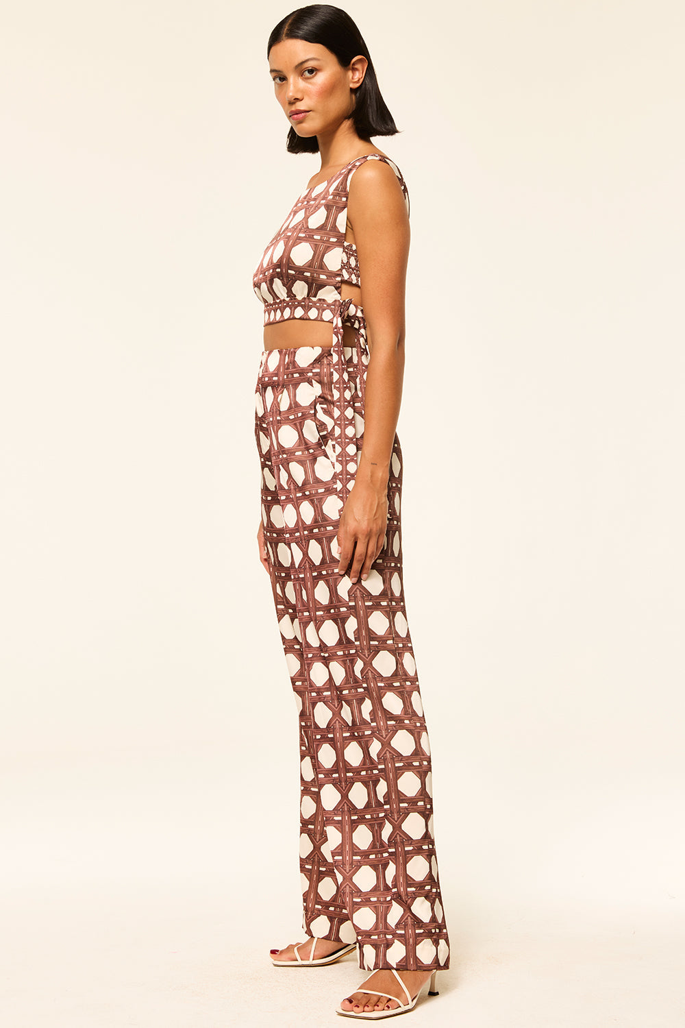 Our high-rise Rita pant is cut from Chocolate Rattan printed satin. Featuring straight legs and side slant pockets. A hidden zip front and extended hook-and-bar closure. Pair with the coordinating Olena top and Celine top for a head to toe spring-ready set.