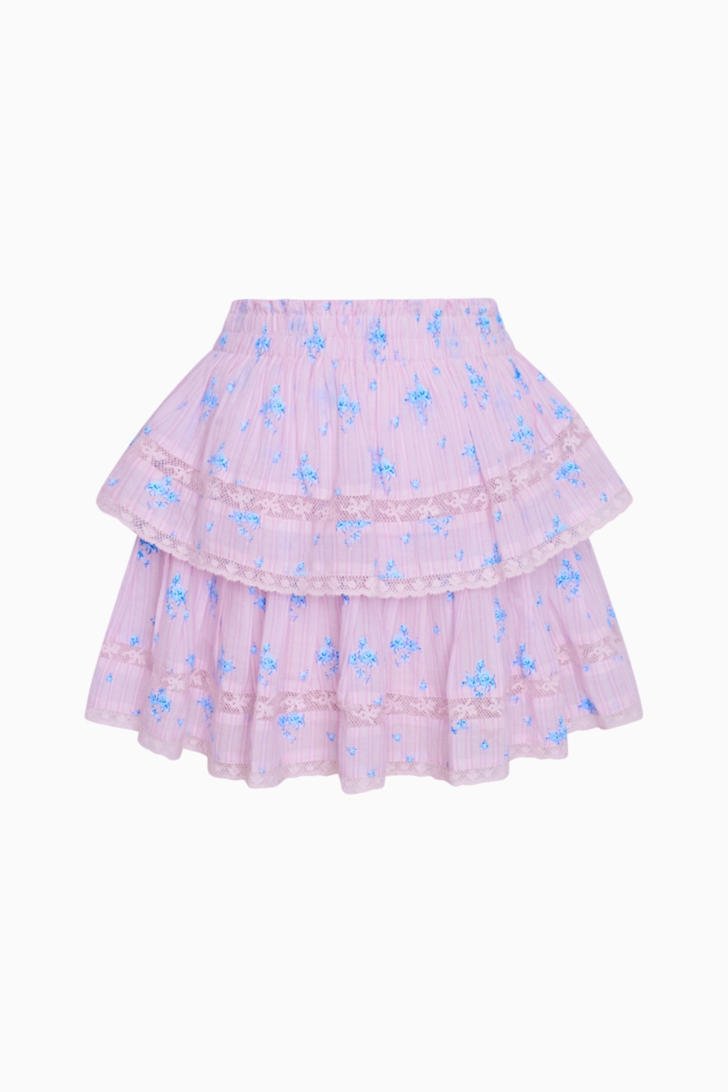 Our best-selling Ruffle Mini Skirt returns with a striped cotton voile fabric featuring a ditsy floral print all over. She features intricate inset lace trims and allover pintuck details. The elasticated waistband offers flexibility in comfort and styling. Tiered ruffles exude effortless femininity. The mini is finished with a frayed, raw hem for added playfulness.