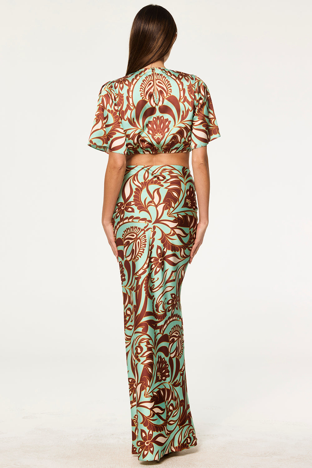 Our best-selling Sierra skirt is a maxi A-line silhouette cut on the bias for a fluid, flattering drape. Designed with a gathered waist and hidden side zip closure, it’s crafted from our Brown Vintage Botanical printed satin on a striking mint ground. Pair with the coordinating Roni top for an elevated summer look—perfect for every event on your social calendar.