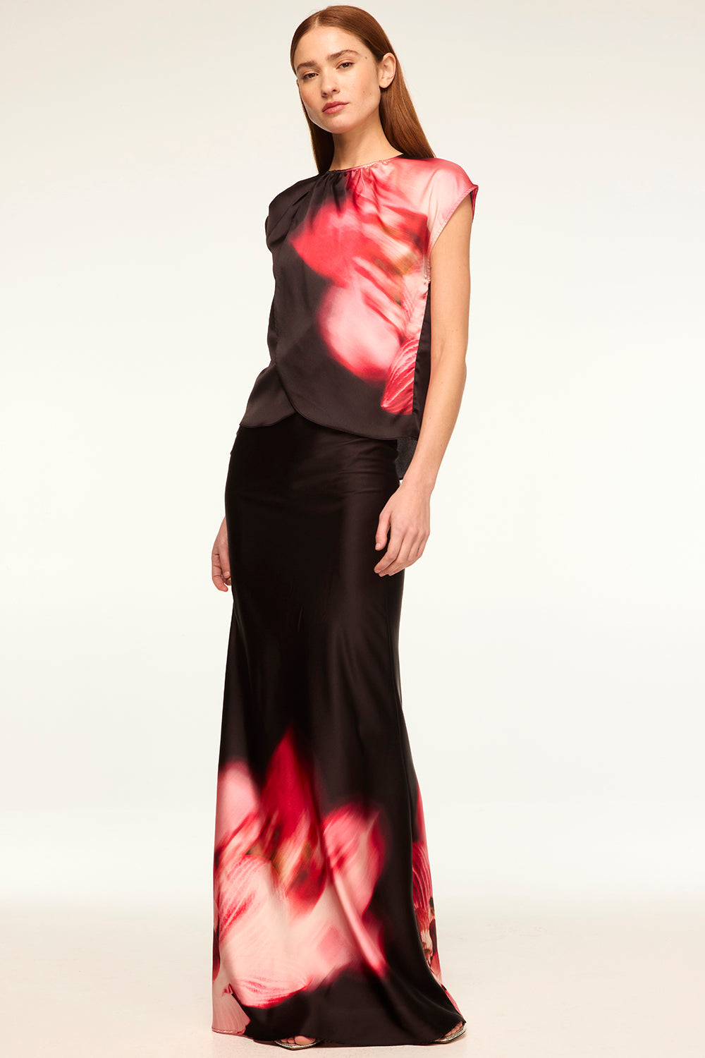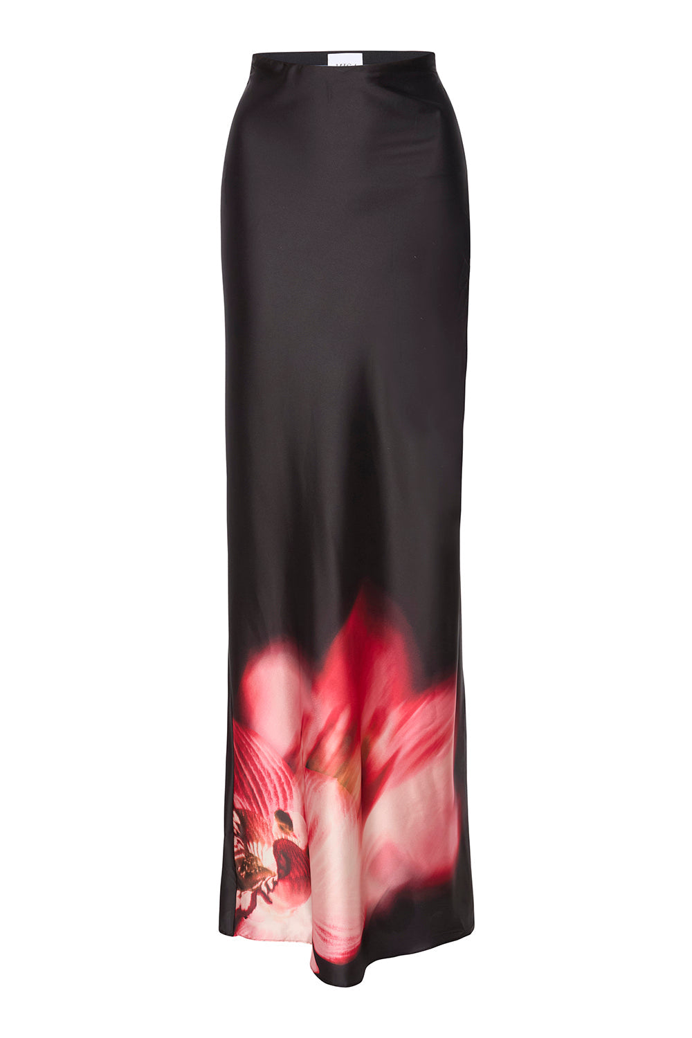 Our new Sierra skirt is a maxi a-line silhouette with a gathered waist and hidden side zip closure. Cut from black satin with a beautiful blurred orchid printed at the hem. Pair with the coordinating Jessie top for an event-ready look or dress down with our Nadja or Lula layering pieces.