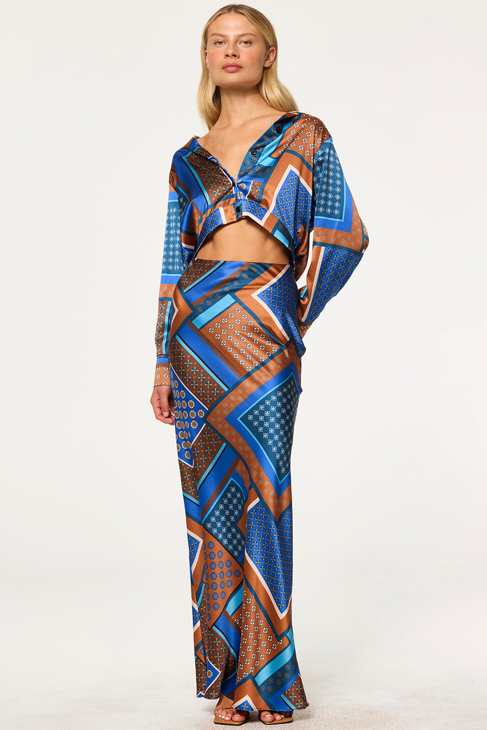 Our best-selling Sierra skirt is a maxi A-line silhouette cut on the bias for a fluid, flattering drape. Designed with a gathered waist and hidden side zip closure, it’s crafted from our Tile Patchwork printed satin in brown and electric blue hues. Pair with the coordinating Mae top for an elevated summer look or with the Nadine jacket to transition into fall.
