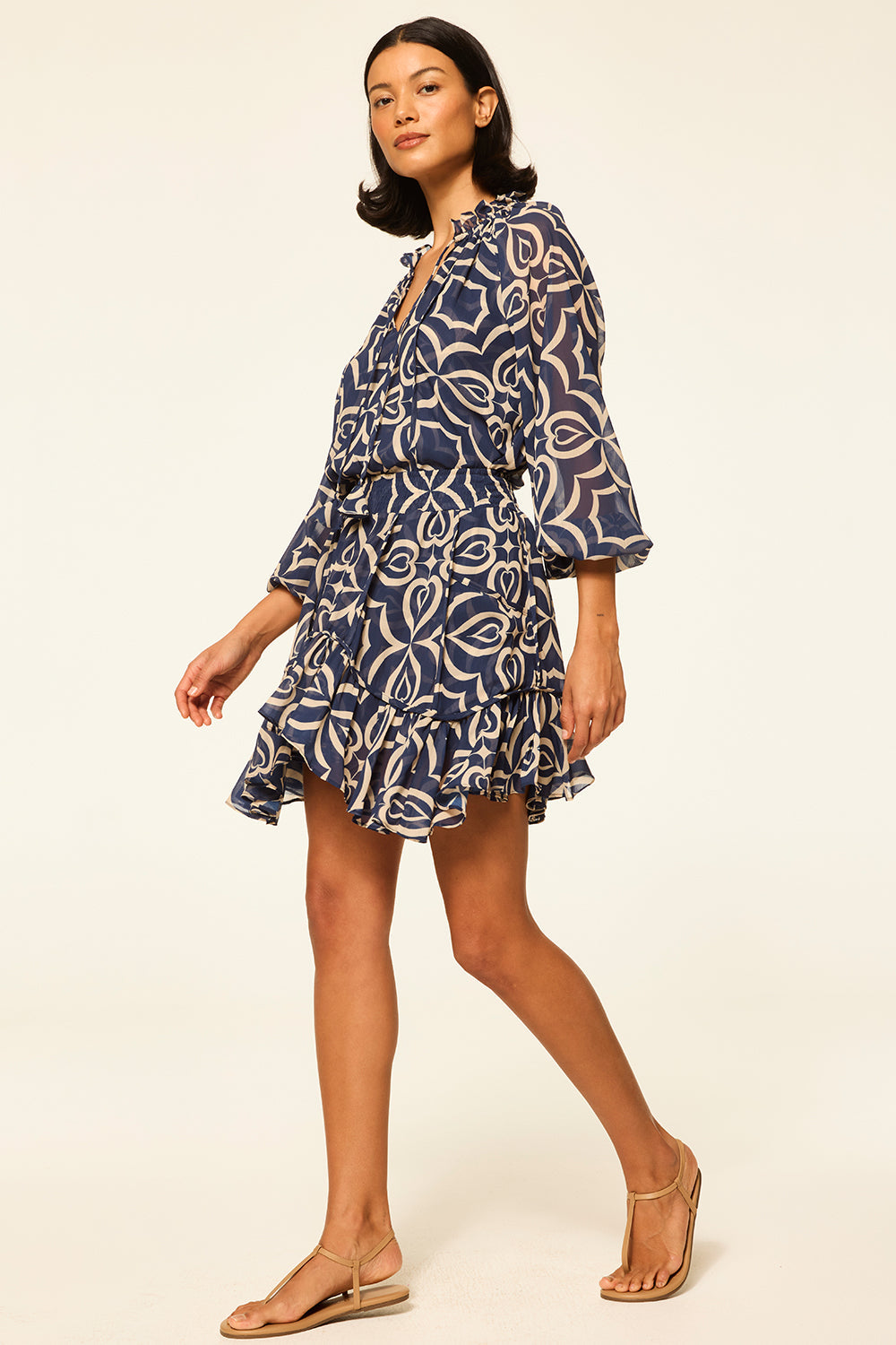 Soma is an easy mini silhouette cut from our Blue Mosaic Tile–printed chiffon. Designed with a wide smocked waistband, it flows into an airy skirt featuring an asymmetric ruffle hem and scoop pocket details. Pair it with a solid ribbed tank or the coordinating Bella top for a relaxed, put-together look.