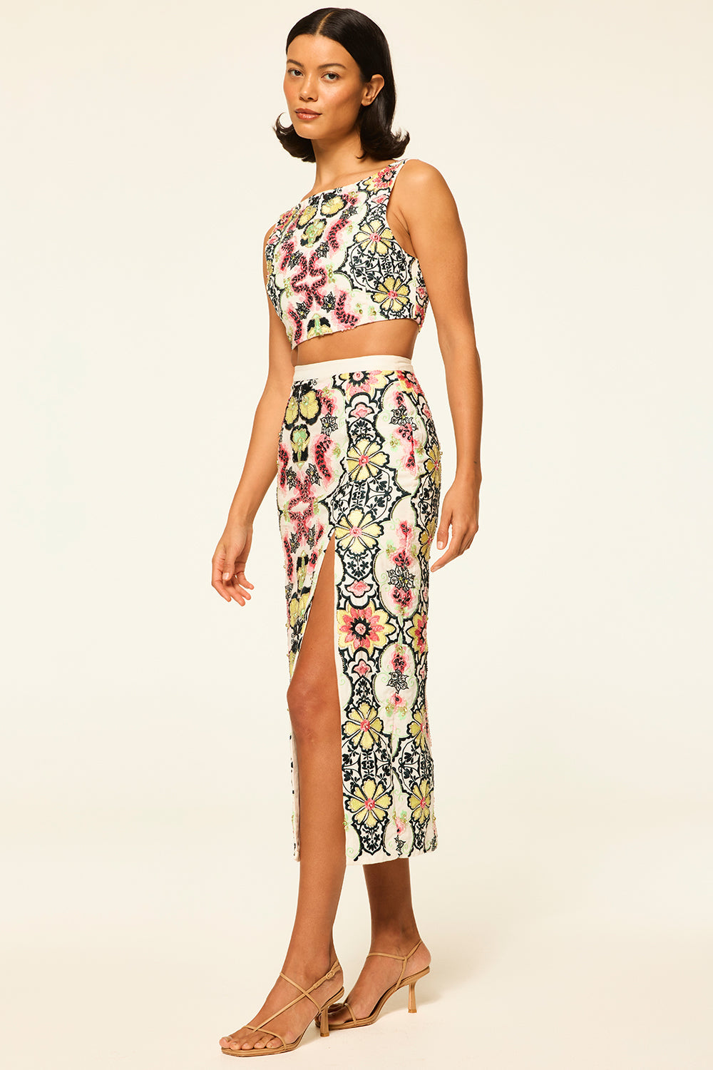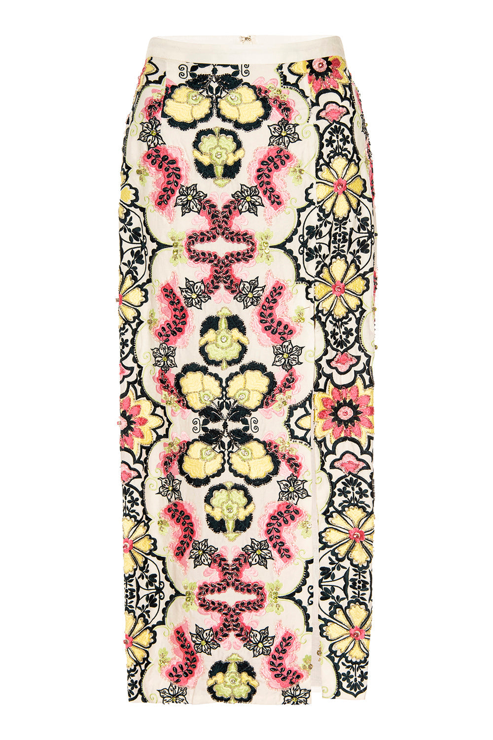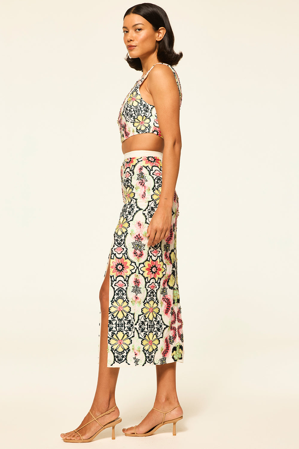 Tani is a head-turning midi pencil skirt featuring gorgeous hand beaded floral details in bold pops of color on a cream fabric ground. Sits high on the waist and features a mid-thigh slit. Hidden zip closure. Pair this special style with the coordinating Basa top for a head-to-toe look worthy of any special occasion.