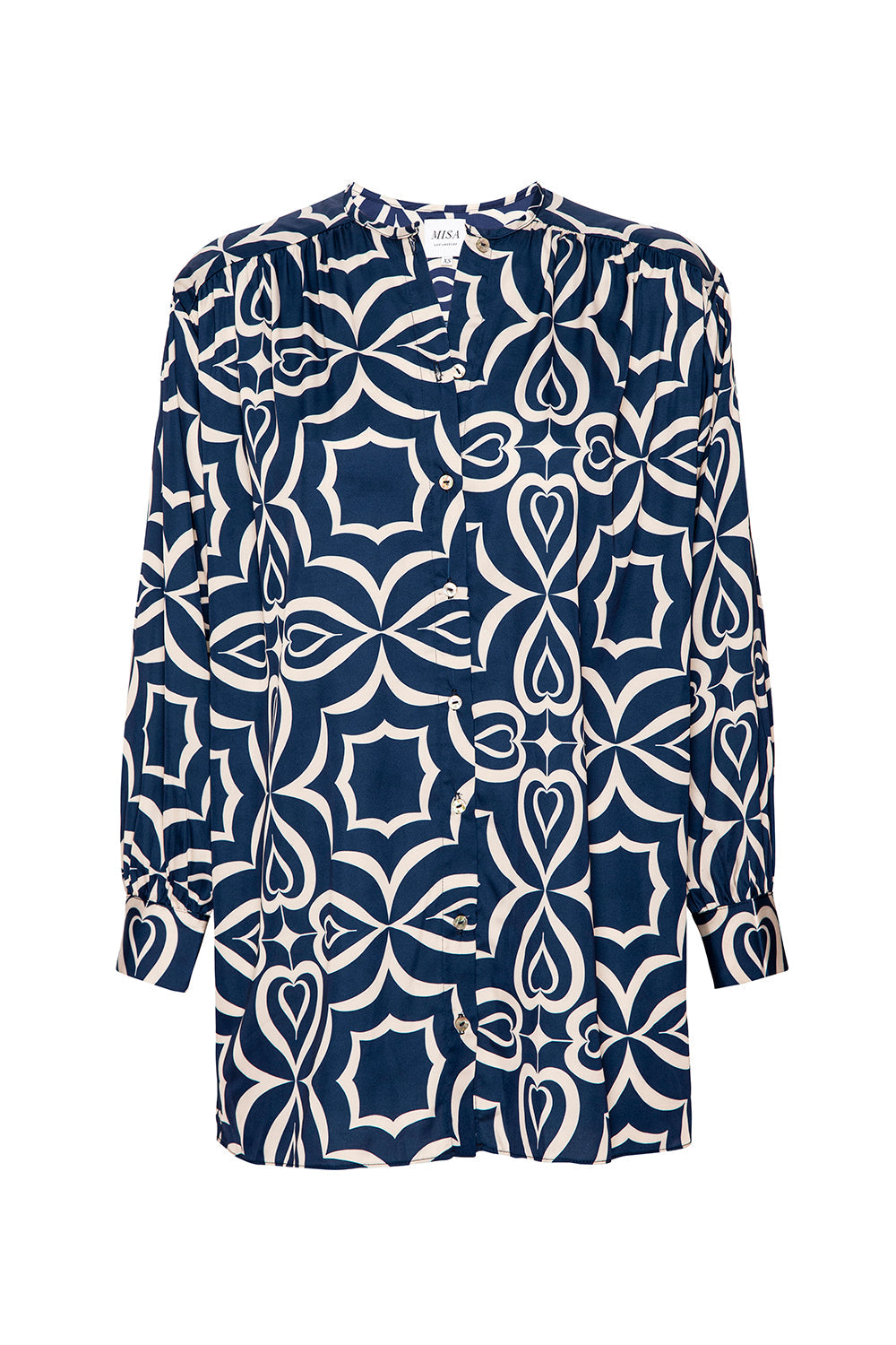 Our Teodora top brings effortless sophistication to your wardrobe in our Blue Mosaic Tile–printed satin. Designed with a high neckline, button front, and long sleeves with button cuffs, it’s a versatile piece that pairs perfectly with the coordinating Reshma pant or your favorite jeans for a look that’s both chic and timeless.