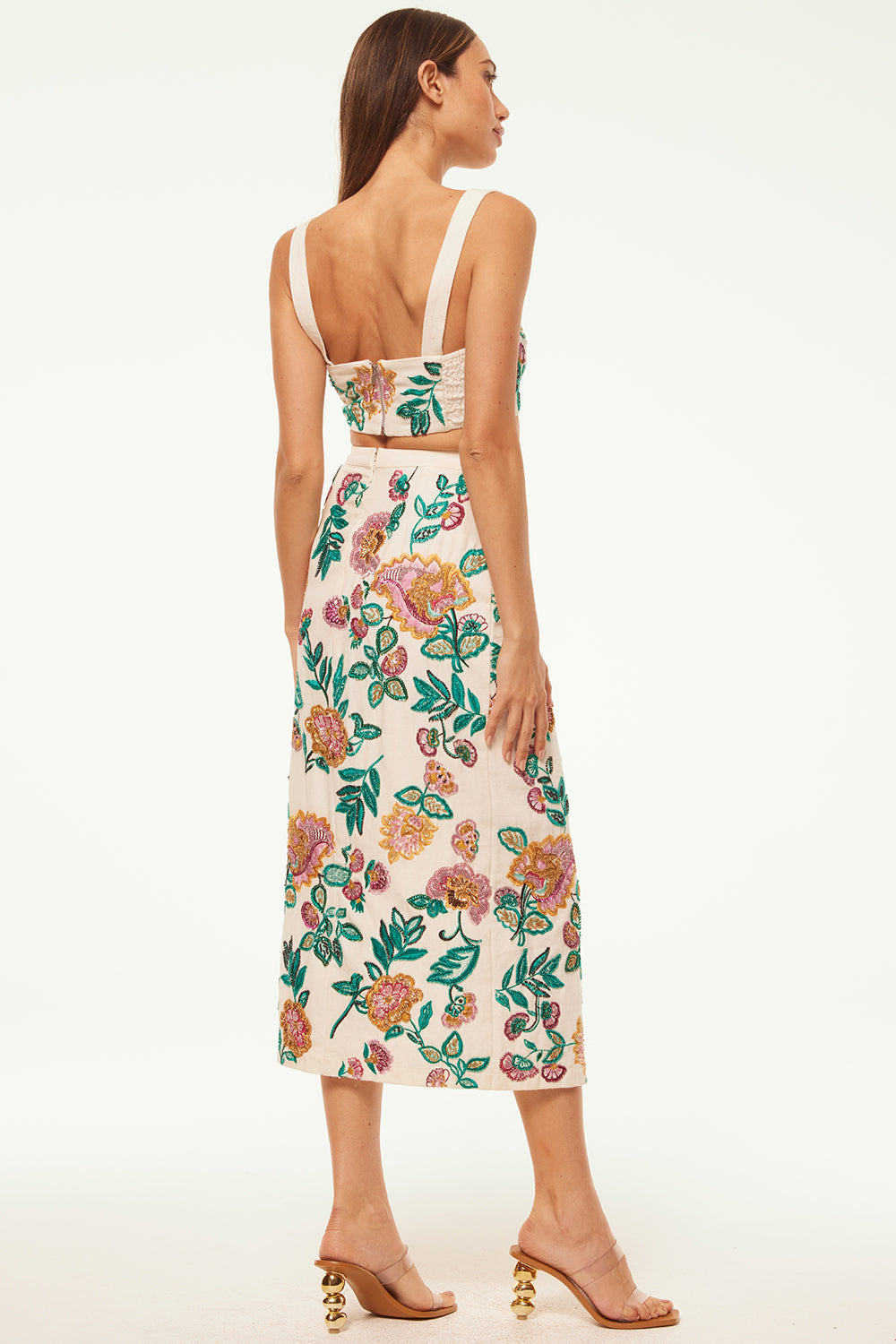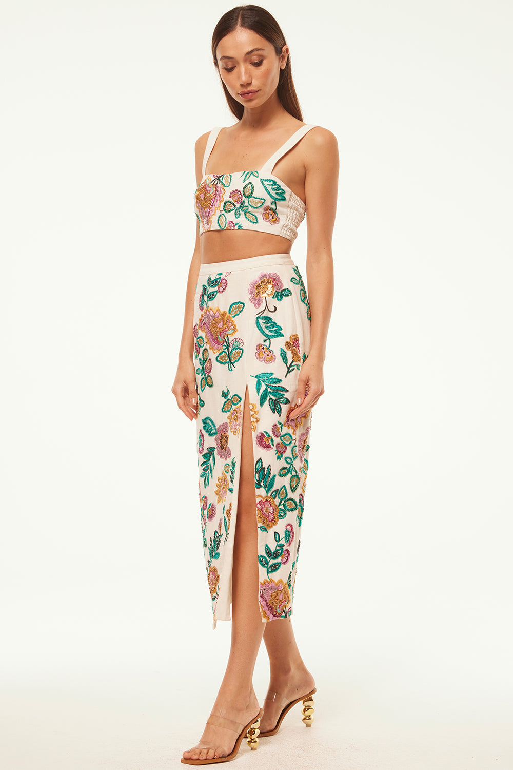 Thema is a head-turning midi pencil skirt featuring gorgeous hand beaded florals and paisleys on a cream fabric ground. Sits high on the waist and features a mid-thigh slit. Hidden zip closure. Pair this special style with the coordinating Driss and Bashira tops or the stunning Salima jacket for a special occasion worthy look.