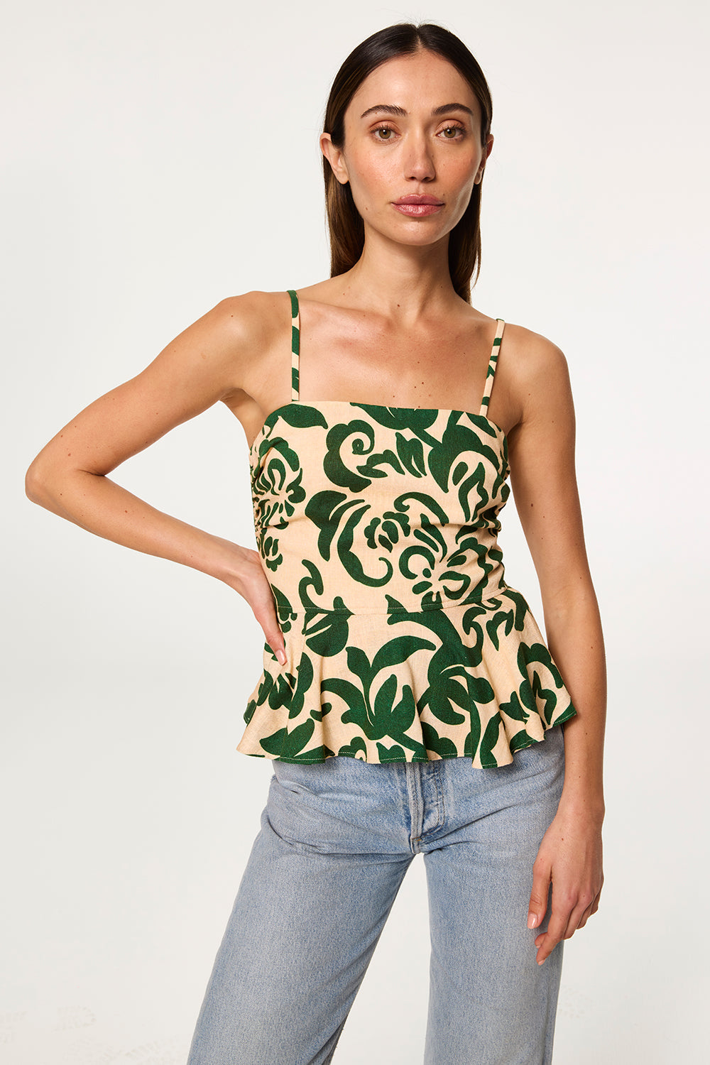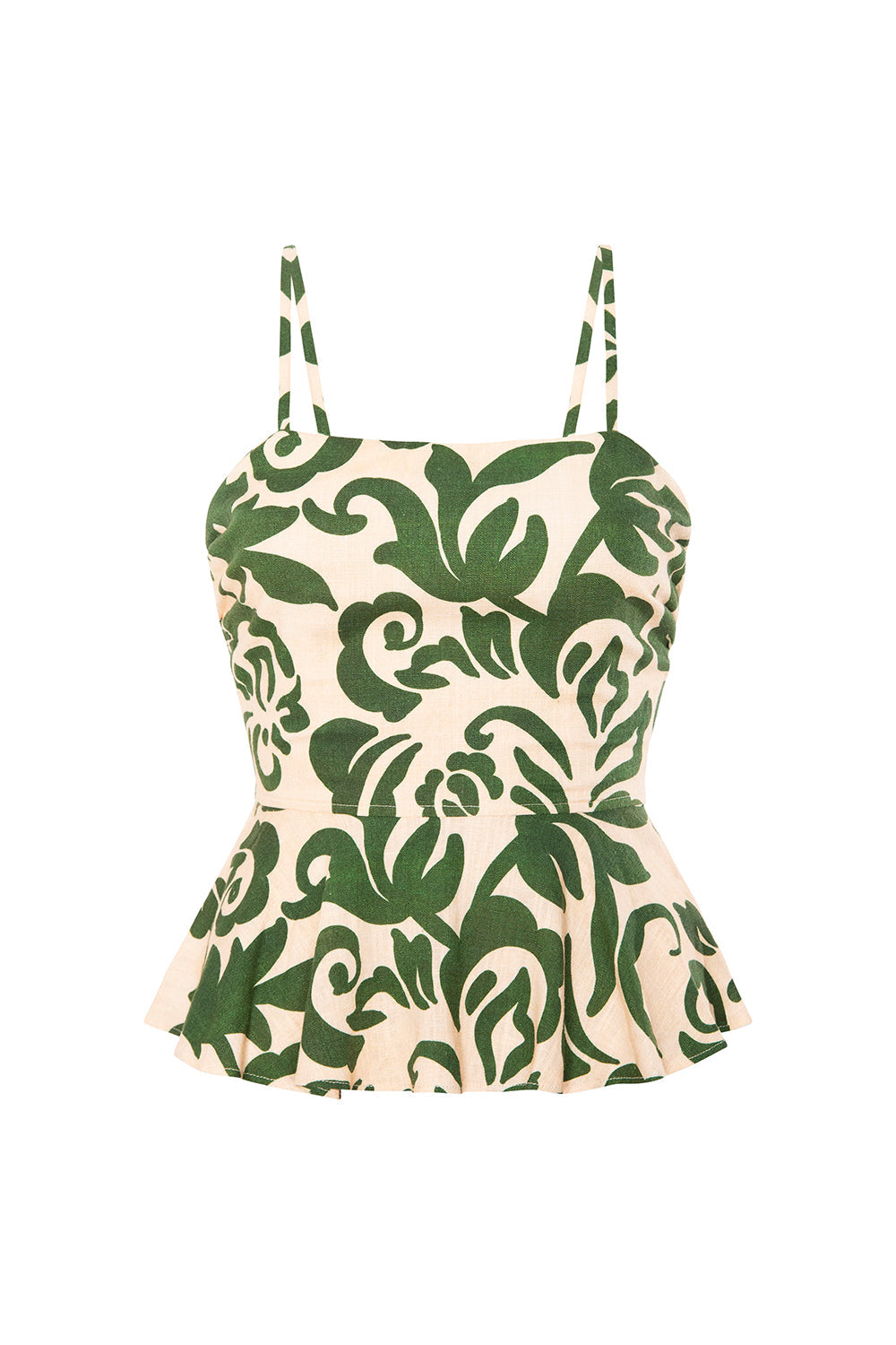 Trista is a chic peplum top cut from our Tonal Cactus printed linen blend. Featuring a fitted bodice with a straight neckline and stretch scrunch spaghetti straps, it’s designed with a wide smocked back and hidden zip closure for a flattering, flexible fit. A wide ruffle peplum hem adds a feminine touch. Pair with jeans or the coordinating Noreen pant for the perfect summer set.